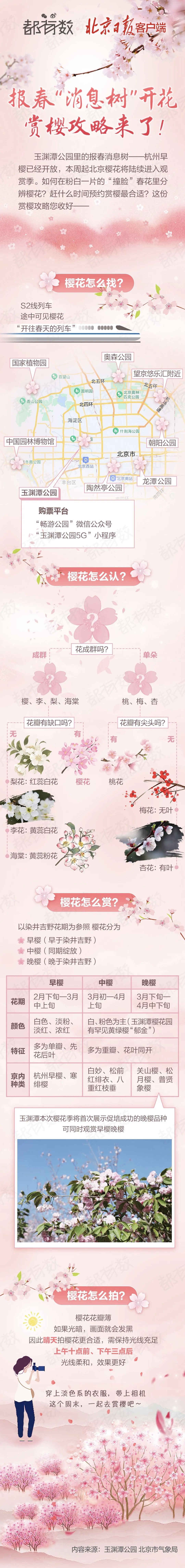 玉渊潭公园里的报春“消息树”——杭州早樱已经开放。本周起北京樱花将陆续进入观赏季。如何在粉白一片的“撞脸”春花里分辨樱花?什么时间预约赏樱最合适?这份赏樱攻略您收好——