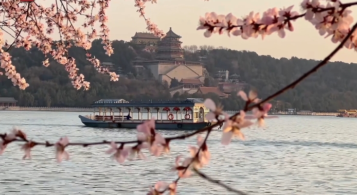 近日,北京颐和园,摄影师拍到西堤桃花迎风吐蕊的宜人风景。开满粉嫩花朵的枝桠在湖面尽情舒展着身姿,水鸟自在飞翔,游船宛如在画中游弋。黄昏时分,水面浮光跃金,暗色树影在夕阳下又美出另一番韵味。