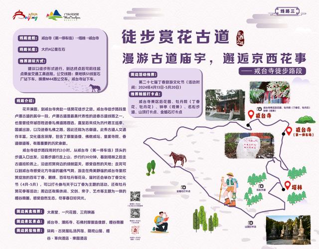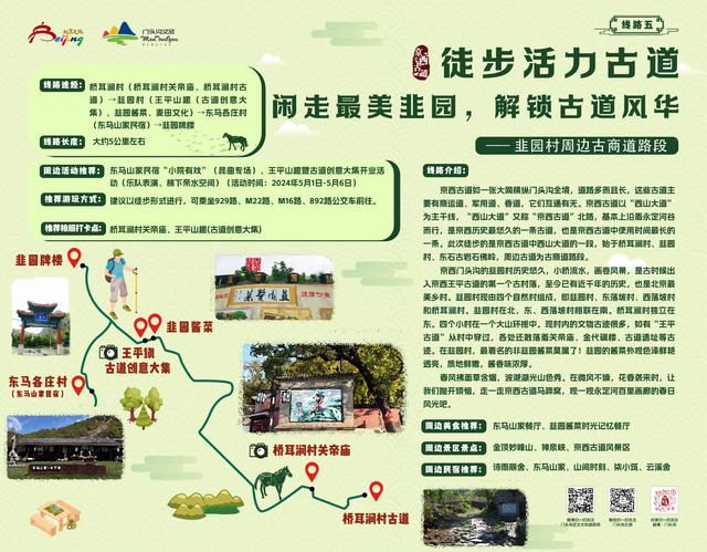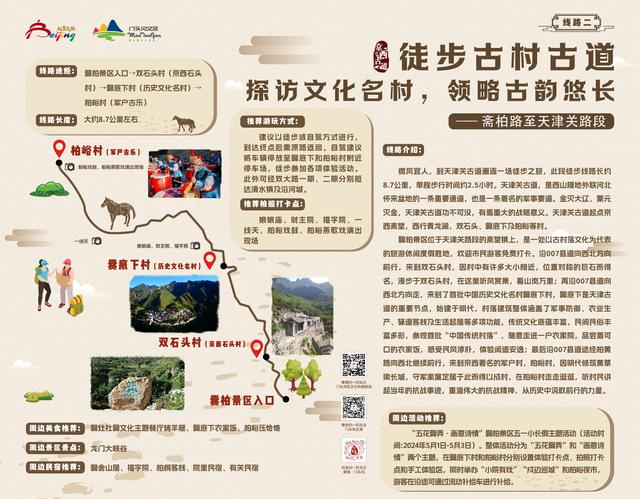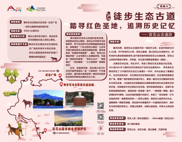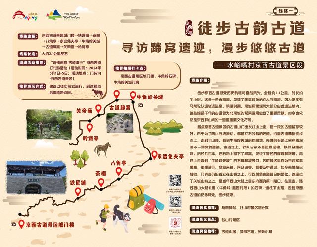 此次推出的6条京西古道主题游线路包括:琉璃渠-丑儿岭-水峪嘴路段、水峪嘴村京西古道景区段、戒台寺徒步路段、韭园村周边古商道路段、爨柏路至天津关路段、百花山古道段,各路段串联了周边的景区、民宿、文化、美食等众多文旅资源点位,让市民游客能够充分领略京西深厚的古道文化和秀美风光。