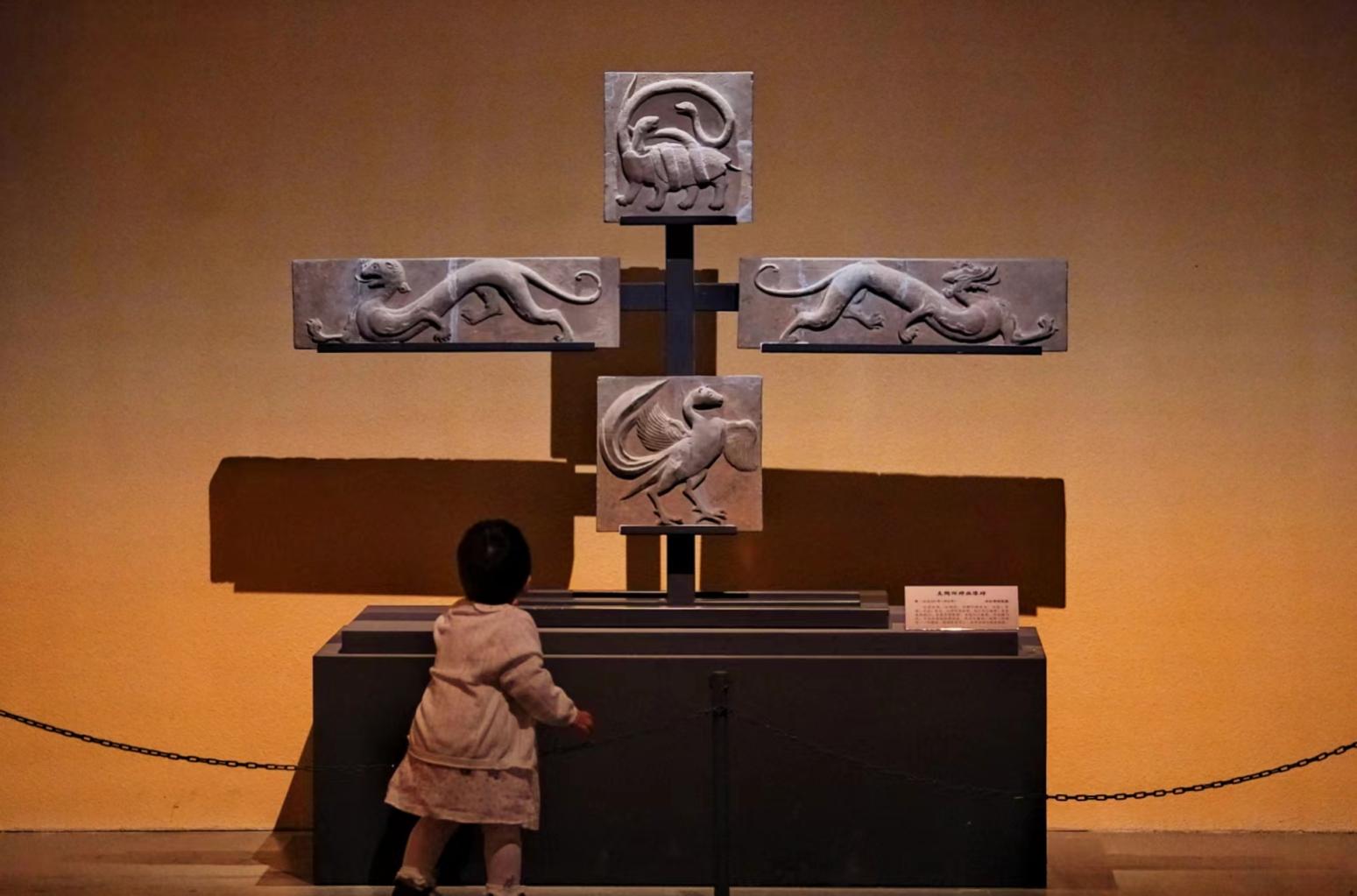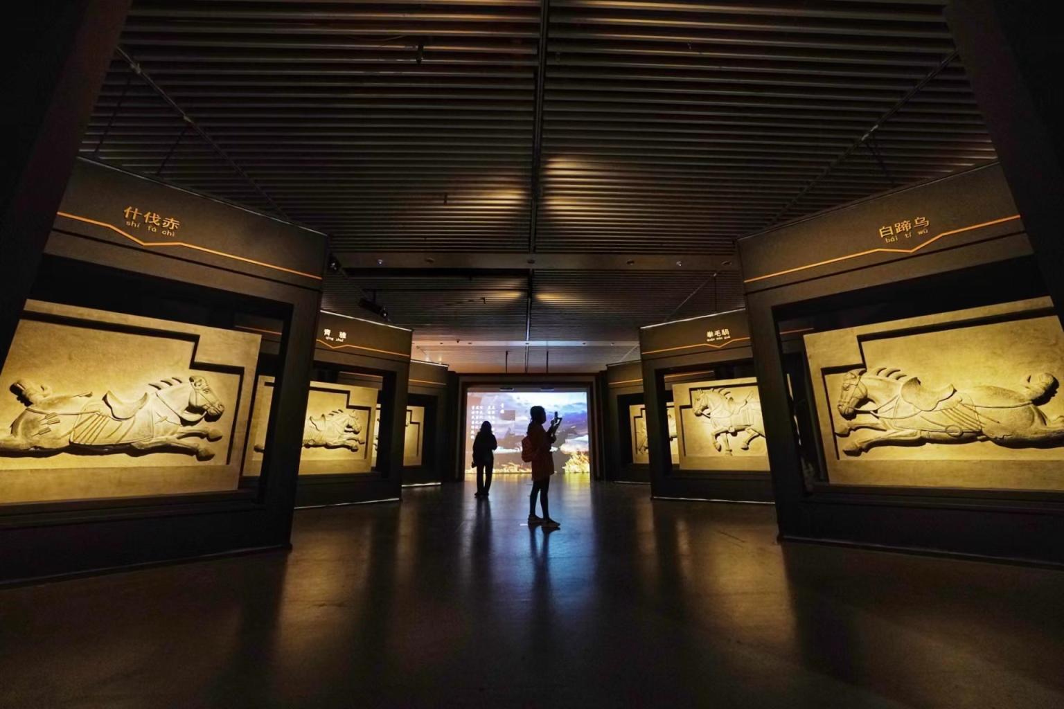 走进展厅,6匹威风凛凛的战马最吸引眼球。这些刻在石头上的浮雕或扬蹄奔驰,或信步行走,线条简洁,生动传神。讲解员说,这6件石雕来自唐太宗昭陵,史称“昭陵六骏”,是跟随李世民征战沙场的功臣,名字分别为:拳毛騧、什伐赤、白蹄乌、特勒骠、青骓、飒露紫。“当时,好马都是从西域运过来的,人们把西域人对马的称谓直接转译成了中文,所以名字才显得有些特殊。”讲解员说。