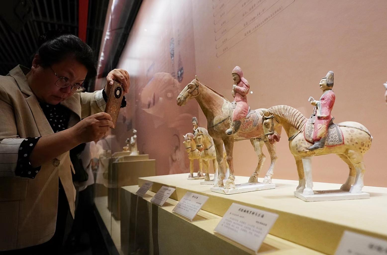 唐代是制作陶俑的巅峰时期,展厅中,形态各异的陶俑上演了一幕幕生动的唐代“生活秀”。一手扬起、一手捂嘴,仰天长啸——一对彩绘釉陶骑马长啸俑的姿态让人忍俊不禁。在唐代,啸指的是在手指、口型及舌尖的配合下发出不同的歌啸,用于仪式表演。相邻的一件白陶抬蹄马同样与当时的娱乐生活有关。只见“马”的肌肉健硕、姿态优雅,扬颈低头,身体重心落在左前腿和两条后腿上,似乎正随着乐曲有韵律地踩着舞步。讲解员说,舞马是唐代宫廷重要的娱乐项目。一件头戴“防晒头巾”的女骑马俑也很有趣。其实,包住俑头发、脖子的是“羃䍦帽”,从西北地区传入,既能防风沙,也能遮面以免路人窥视。