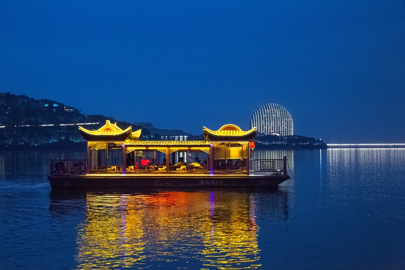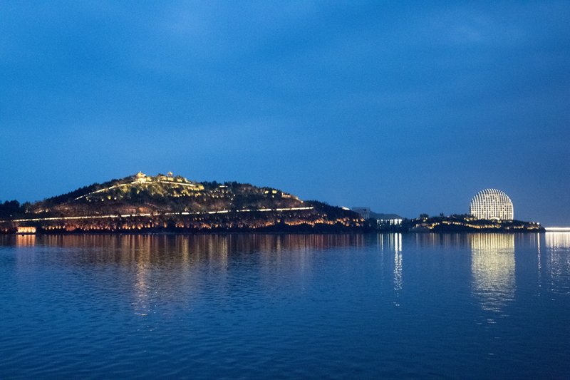 春风拂面,水波微澜,灯光点缀下的雁栖湖夜晚景观颇具魅力。多彩的灯线沿周边山脉延伸,自然山水在灯光的映衬下更加绚丽夺目。游客可乘游船在雁栖湖上夜航,尽享夜幕下湖光山色。