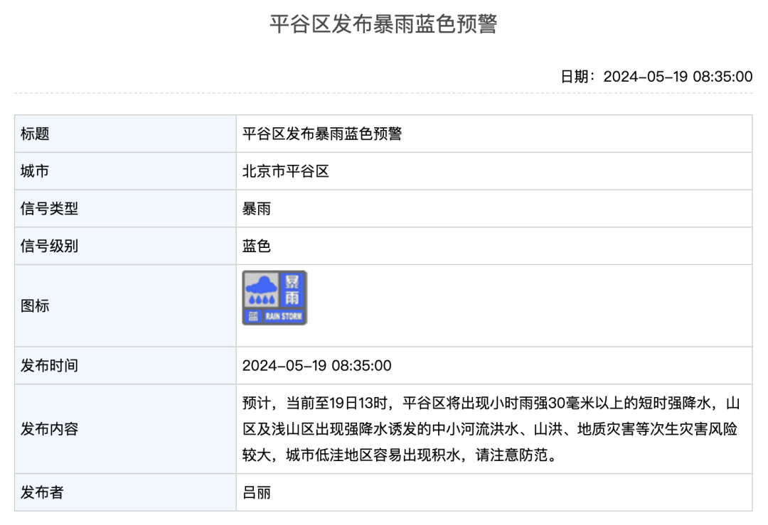今天8时35分,平谷区发布暴雨蓝色预警:预计,当前至19日13时,平谷区将出现小时雨强30毫米以上的短时强降水,山区及浅山区出现强降水诱发的中小河流洪水、山洪、地质灾害等次生灾害风险较大,城市低洼地区容易出现积水,请注意防范。