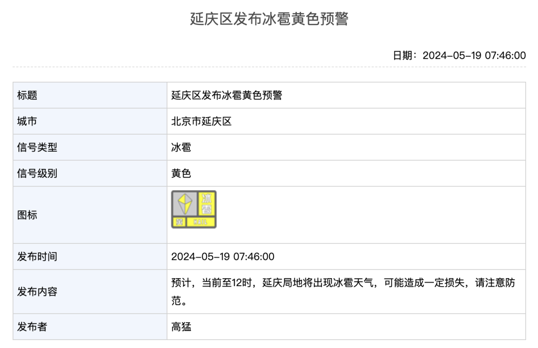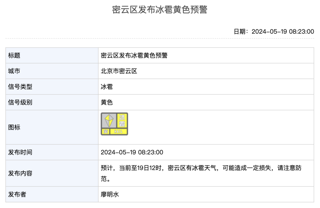 今天7时许起,北京市延庆区、平谷区、密云区、怀柔区、通州区接连发布冰雹黄色预警:预计当前至12时左右,该区局地将出现冰雹天气,可能造成一定损失,请注意防范。