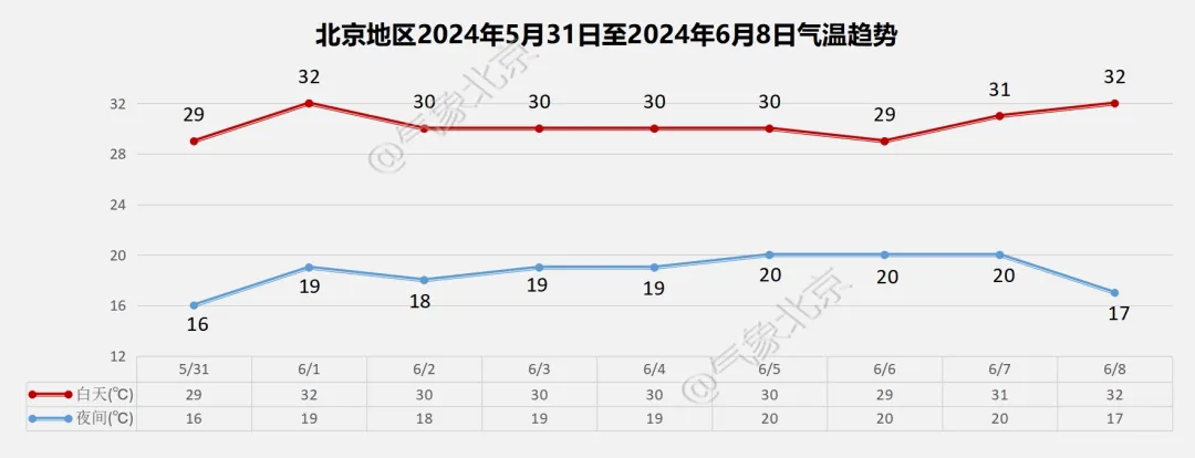 6月1日白天(周六):晴转多云;北转南风2、3级;平原地区最高气温32℃,山区最高气温30~32℃。