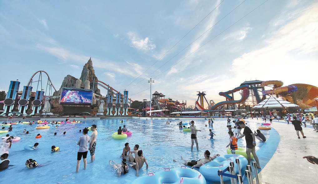 傍晚时分,很多游客从地铁7号线欢乐谷景区站出站后,便直奔欢乐谷景区右手边的北京玛雅海滩水公园。夕阳下的水公园内游客络绎不绝,造浪池内,家长们陪着小宝宝尽情逐浪。远古图腾、精美浮雕、神秘文字……这里不仅有高科技游乐项目,游客还能看到玛雅文化元素的影子。“我们不只是简单地依山造海,而是在这个山海实景叠加的空间,让古老神秘的玛雅文化与现代文明科技实现碰撞。”相关负责人表示。