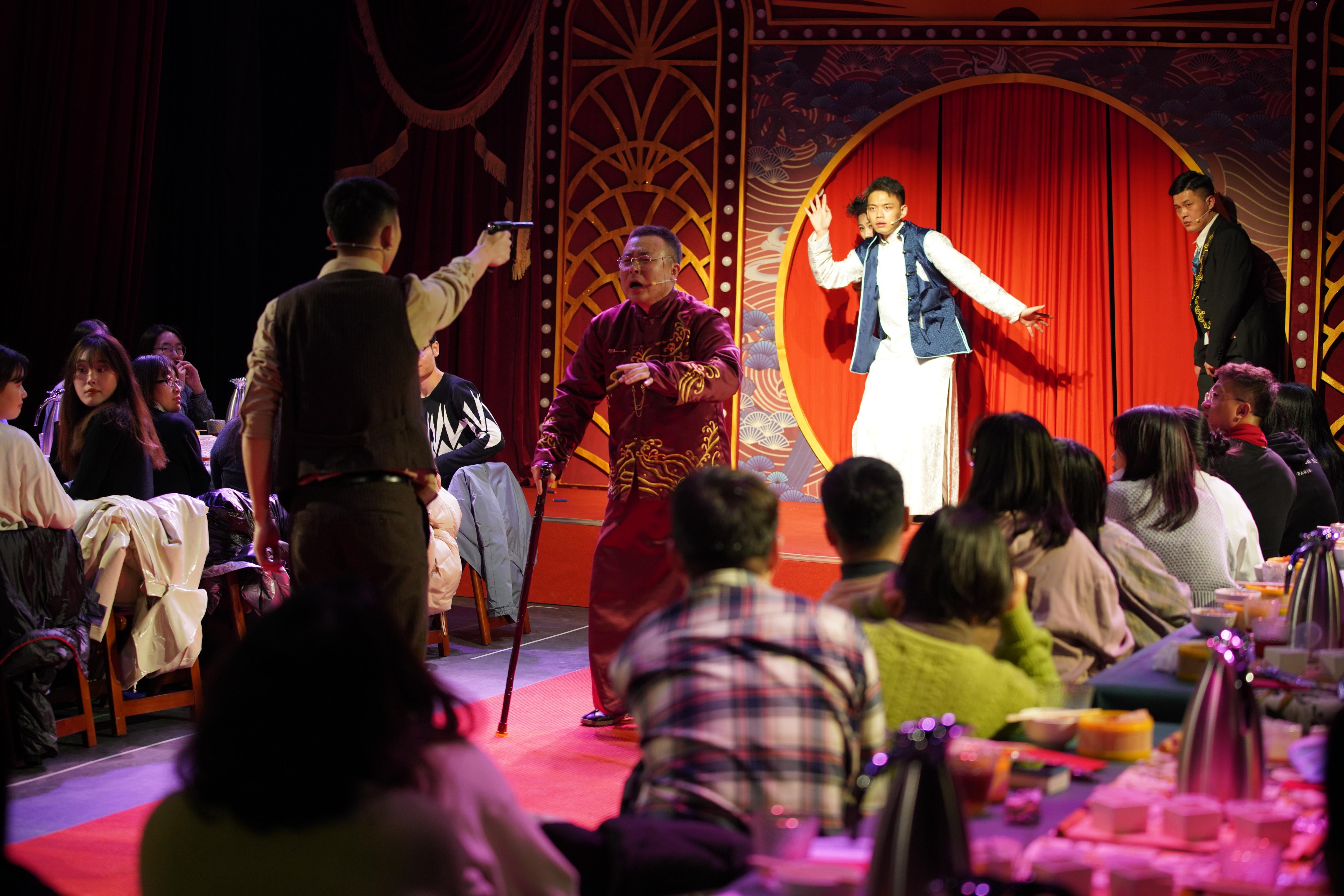 “哎呦!三哥您来啦?好久没见着您了!”随着演出的开始,不断有观众被随机选为配合剧情发展的“客串角色”,无厘头的包袱,不停戳中观众笑点。席间还有魔术、歌舞,以及精心准备的餐食和换装饰品,为观众带来一次复古宴席的沉浸式体验。