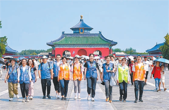 昨天上午,天坛公园红墙绿瓦间,身穿运动马甲的青年代表欢聚一堂,为古老天坛增添了一抹青春亮色。活动由团市委、首都文明办、市交通委、市公园管理中心指导,北京青少年服务中心联合东城团区委、东城区卫健委、天坛公园主办。