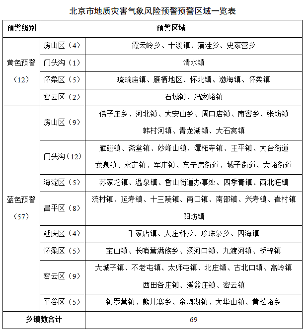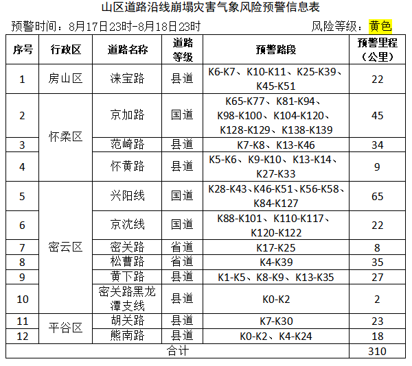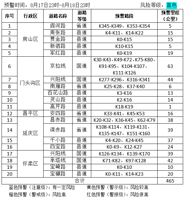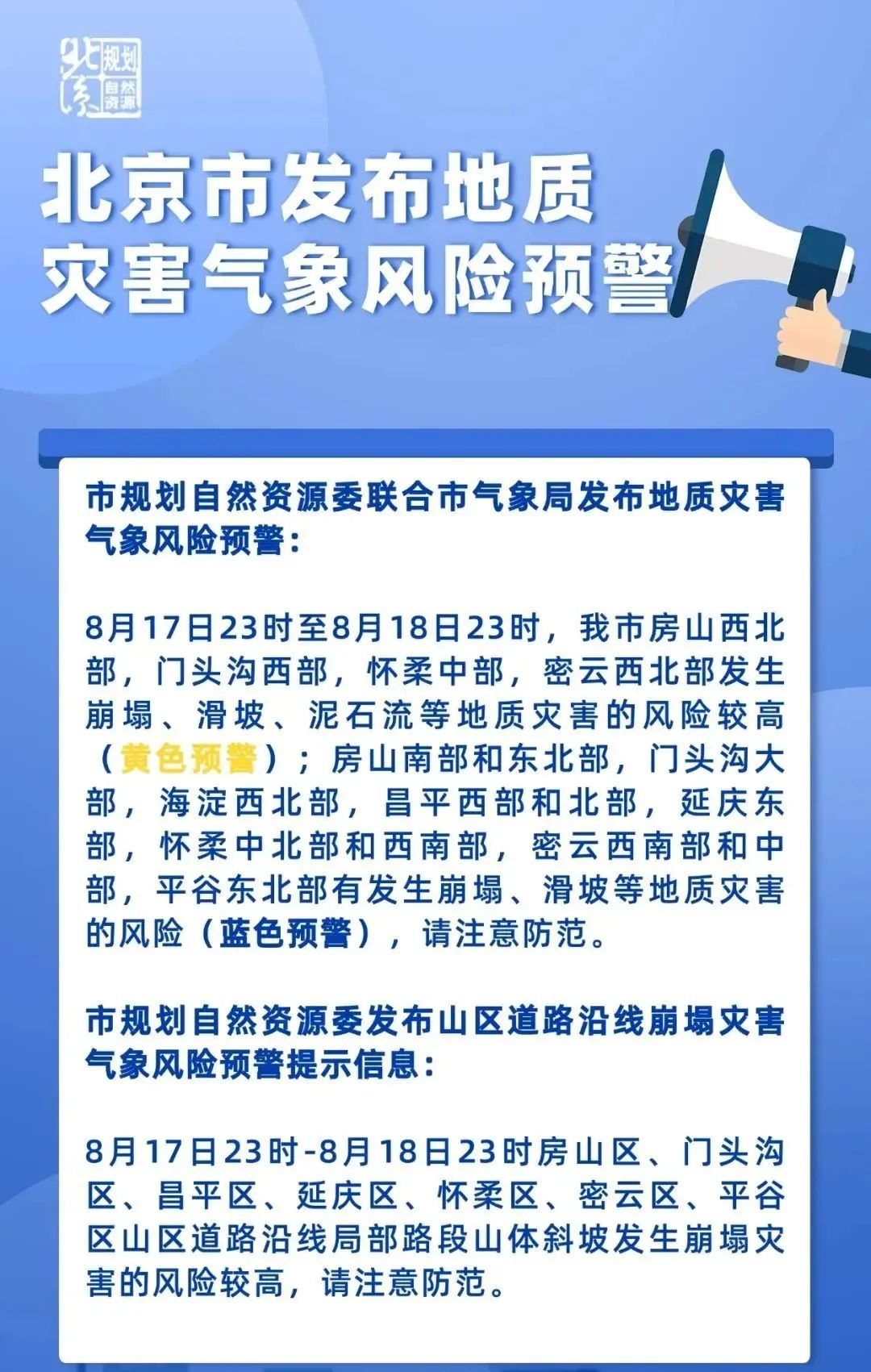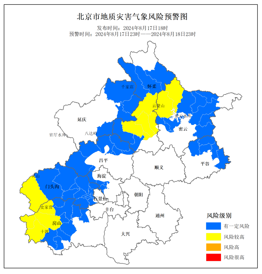 市规划自然资源委联合市气象局8月17日18时升级发布地质灾害气象风险黄色预警,8月17日23时至8月18日23时,我市房山西北部,门头沟西部,怀柔中部,密云西北部发生崩塌、滑坡、泥石流等地质灾害的风险较高(黄色预警);房山南部和东北部,门头沟大部,海淀西北部,昌平西部和北部,延庆东部,怀柔中北部和西南部,密云西南部和中部,平谷东北部有发生崩塌、滑坡等地质灾害的风险(蓝色预警),请注意防范。