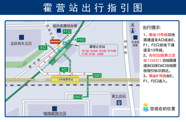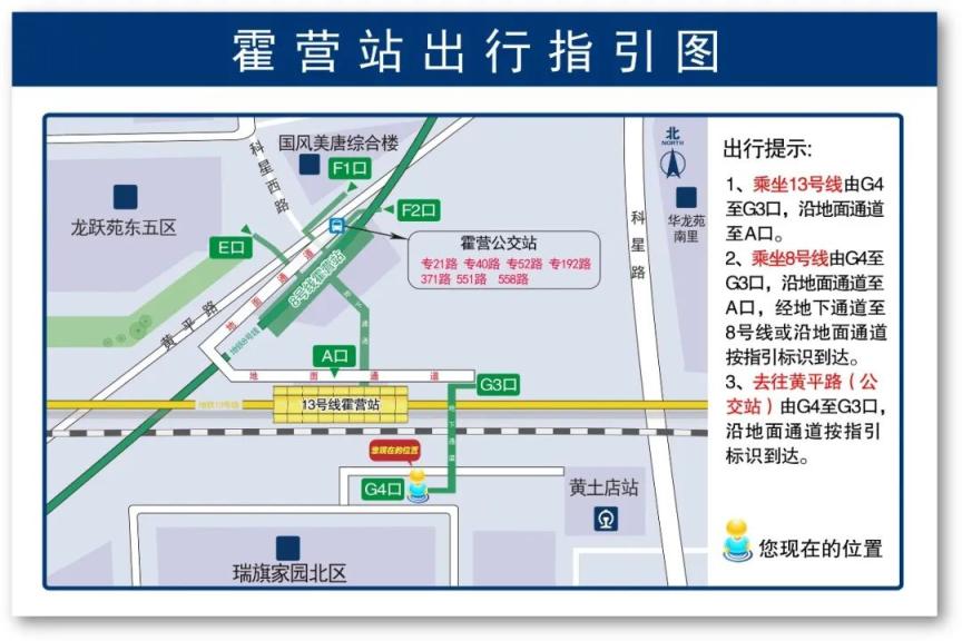 霍营站G1、G2、H口周边坐落着龙跃苑、旗胜家园、华龙苑等社区,以及国风美唐综合楼等商业综合体和商务楼宇,早晚高峰客流量相对较大。为了最大程度降低G1、G2、H口关停对乘客出行带来的影响,霍营综合交通枢纽建设单位提前做好各项准备工作,如张贴公告及出行导引图、配备引导人员等,开展出行导引宣讲和信息告知,让居民早知道、早规划,以确保乘客有序出行。