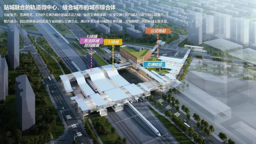 霍营综合交通枢纽建成后,将实现地铁8号线、13B线和市郊铁路东北环线等轨道交通线路集中式、一体化换乘,其中13B线和市郊铁路东北环线可实现同台换乘,有效地减少乘客步行距离,大幅缩短换乘时间,提升换乘效率;枢纽南北及周边居民可通过高架连廊抵离地铁13B线及市郊铁路东北环线高架站厅,打破现状枢纽周边的交通阻隔,有效缓解高峰时期地下通道客流拥挤现象,提供更舒适便利的换乘体验;将成为京北地区功能复合的一体化活力示范区和回天地区重要功能节点。