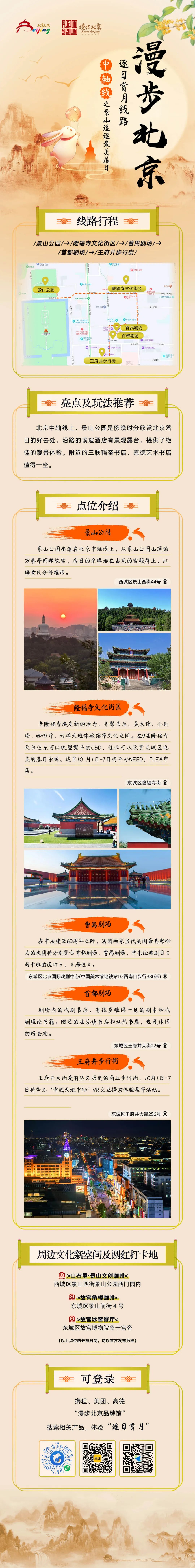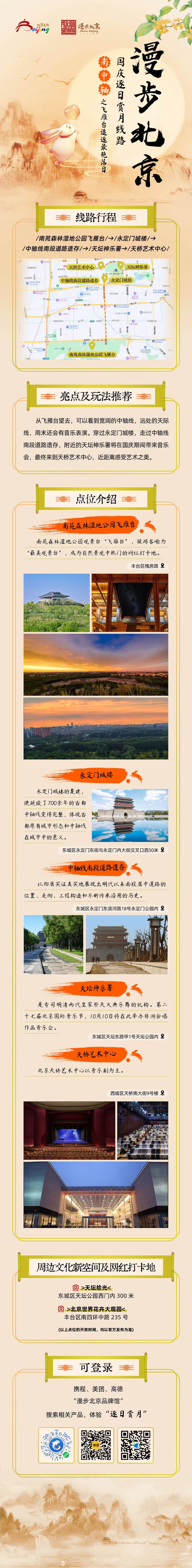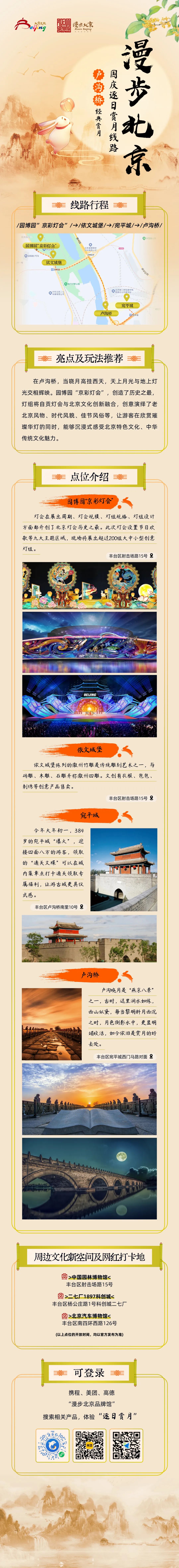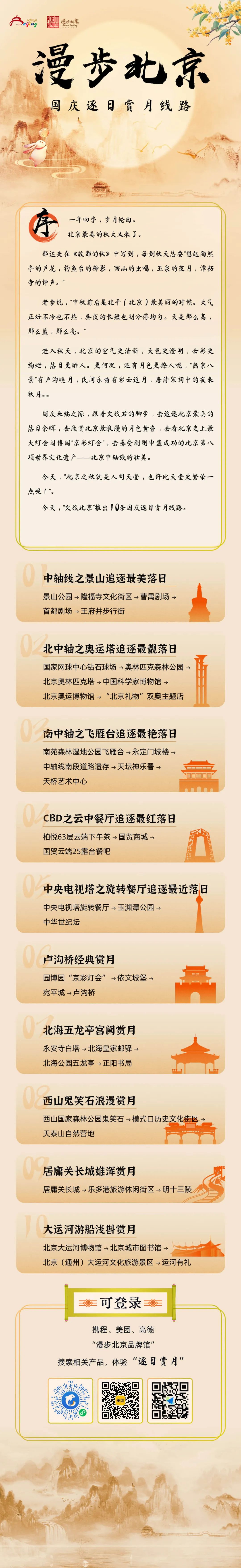 国庆来临之际,跟着文旅君的脚步,去追逐北京最美的落日余晖,去欣赏北京最浪漫的月色黄昏,去看北京史上最大灯会园博园“京彩灯会”,去逛北京最大的国家会议中心和首钢园的服贸会,去感受刚刚申遗成功的北京第八项世界文化遗产——北京中轴线的壮美。