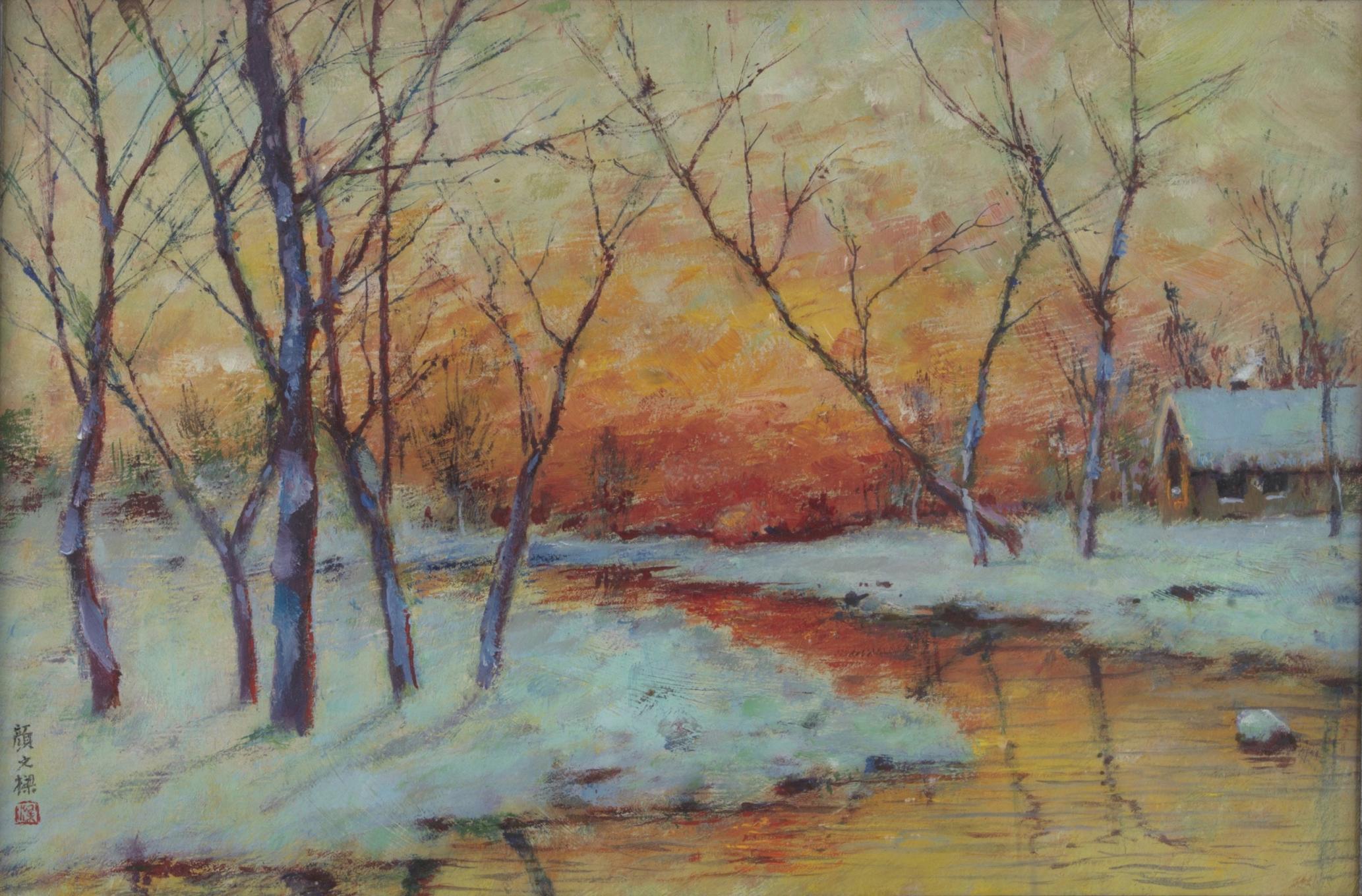 《晚霞雪景》颜文樑 22×33cm 木板油画 1975年 中国美术馆藏