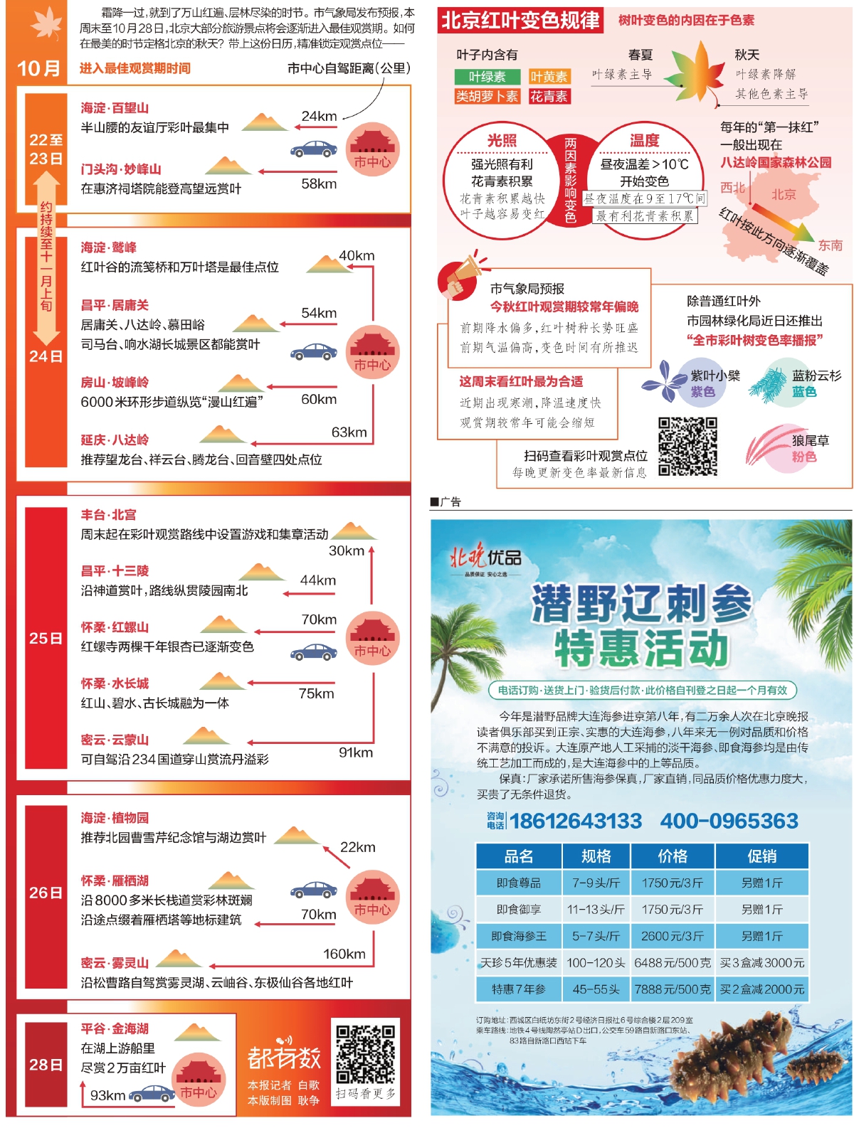 霜降一过,就到了万山红遍、层林尽染的时节。市气象局发布预报,本周末至10月28日,北京大部分旅游景点将会逐渐进入最佳观赏期。如何在最美的时节定格北京的秋天?带上这份日历,精准锁定观赏点位——