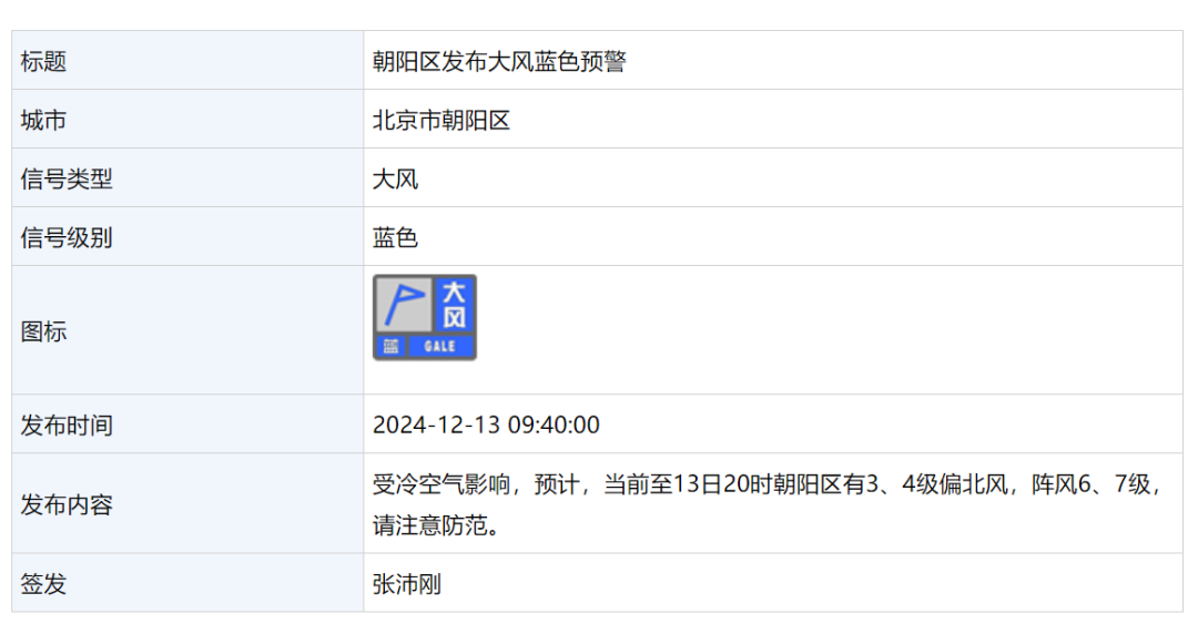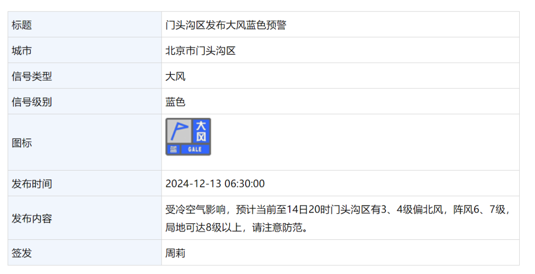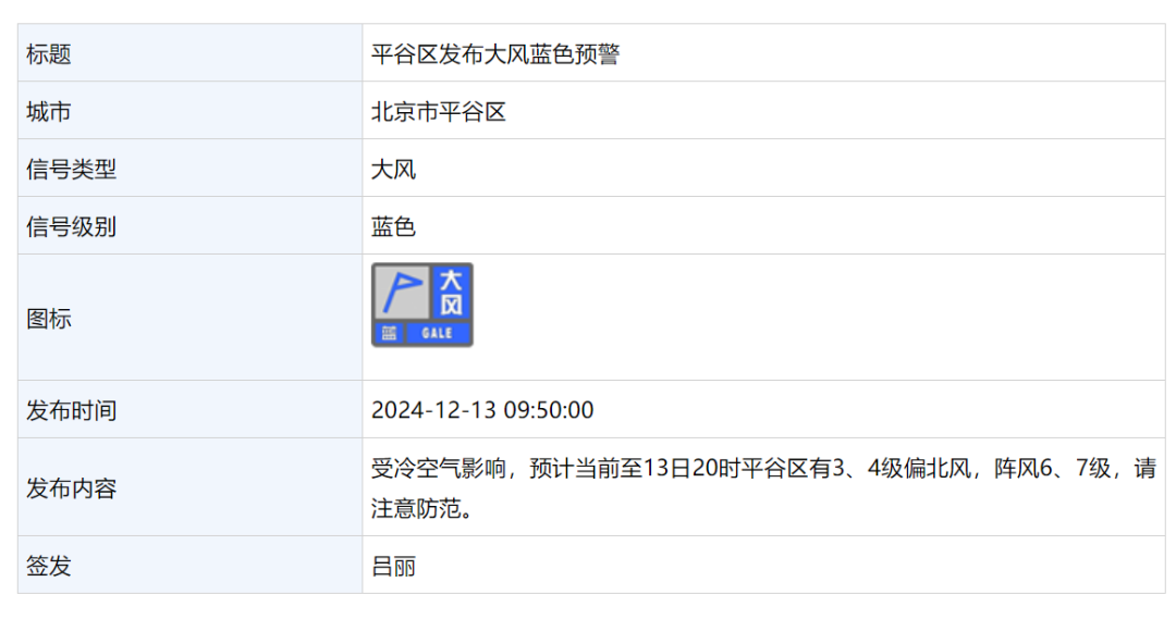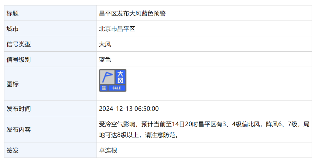12月13日 6:50,昌平区发布大风蓝色预警:
