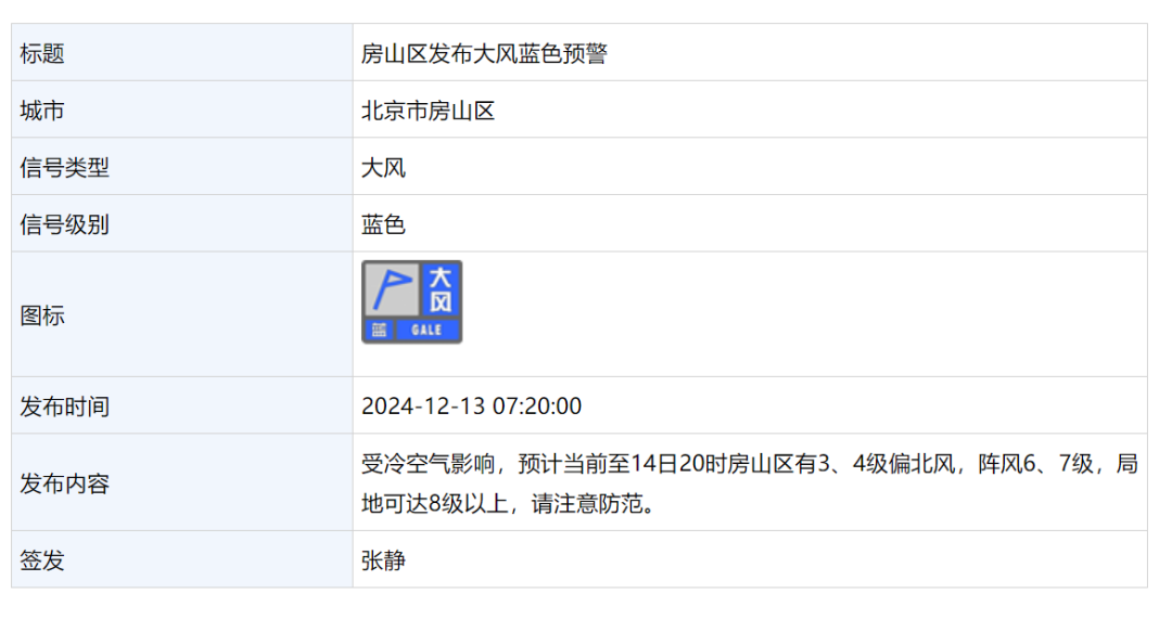 12月13日 7:20,房山区发布大风蓝色预警: