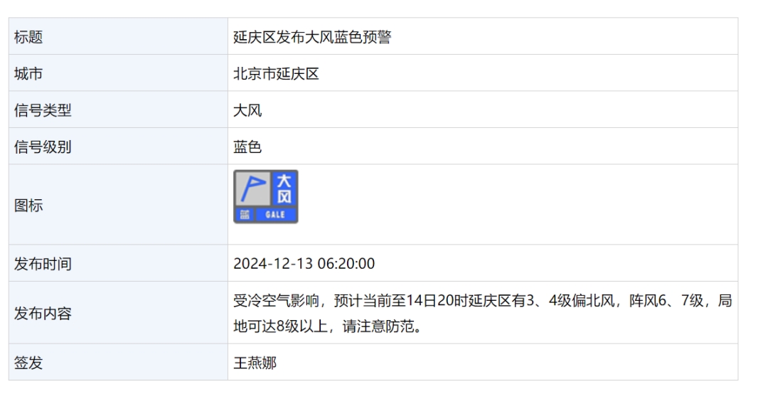12月13日 6:20,延庆区发布大风蓝色预警:
