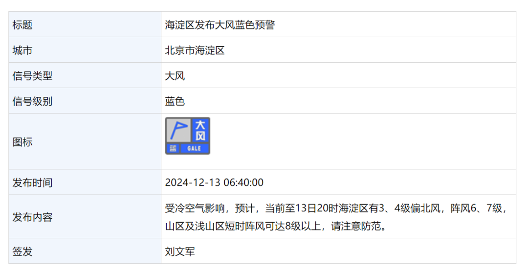12月13日 6:40,海淀区发布大风蓝色预警: