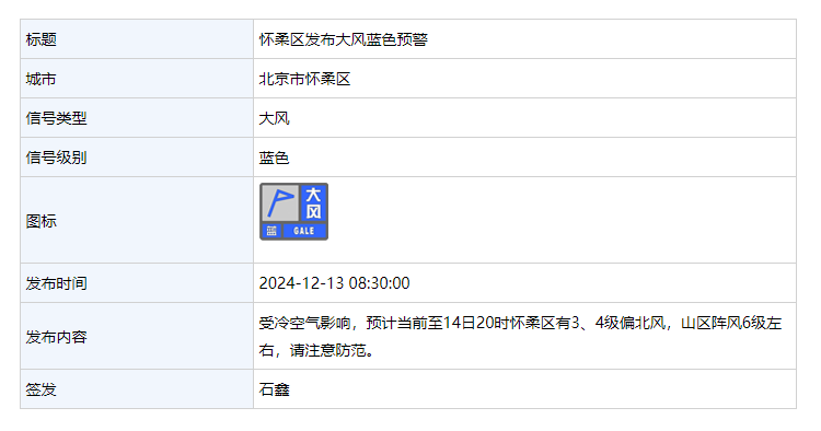 12月13日 8:30,怀柔区发布大风蓝色预警: