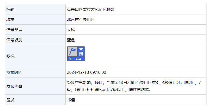 12月13日 9:10,石景山区发布大风蓝色预警: