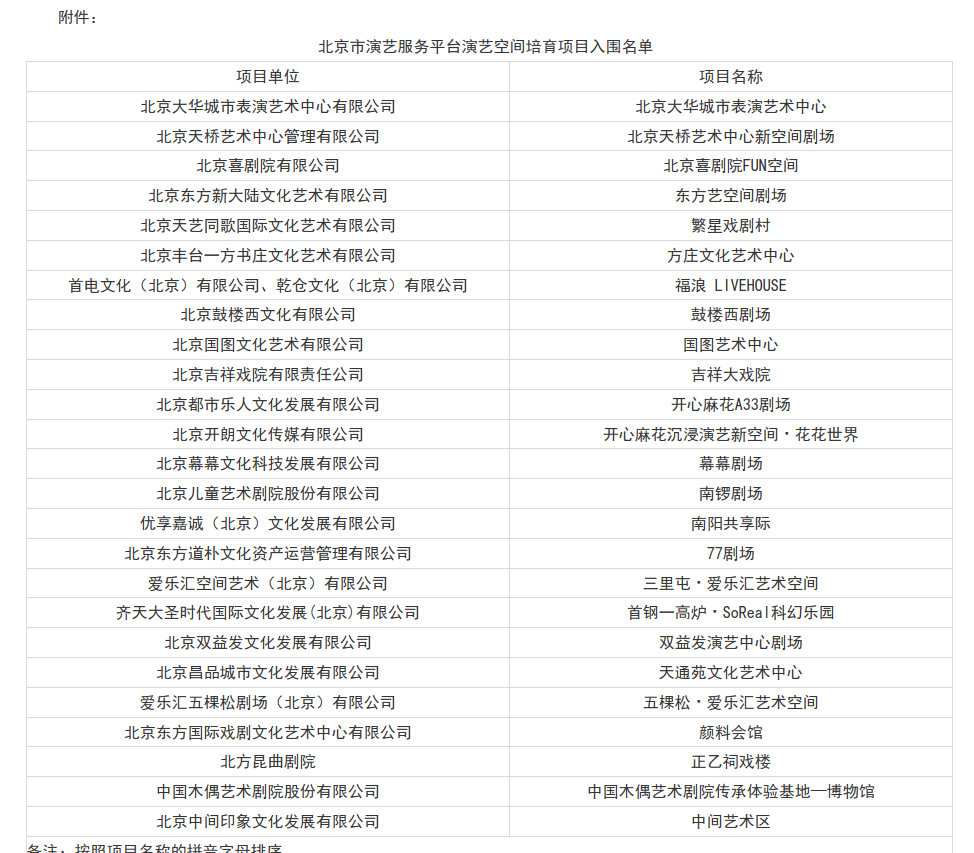 北京市演艺服务平台演艺空间培育项目评审工作已于近日结束。前期,我局下发通知,各区文化和旅游局分别上报了申报对象,我局组织开展了评审工作,现将入围名单予以公示,公示期为12月16日至12月18日。如有异议,请向北京市文化和旅游局反映。