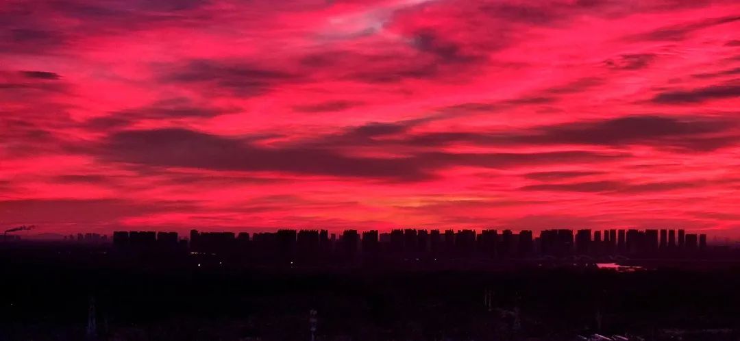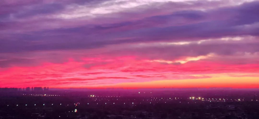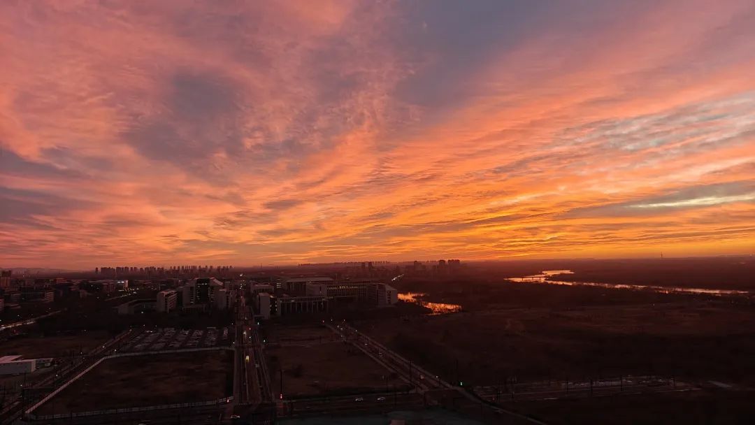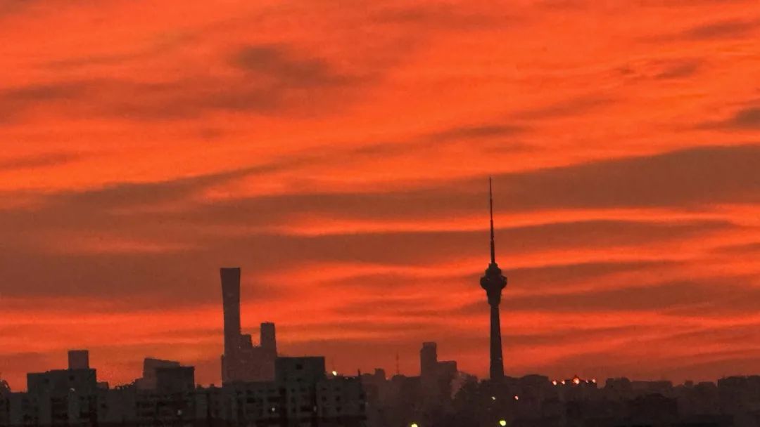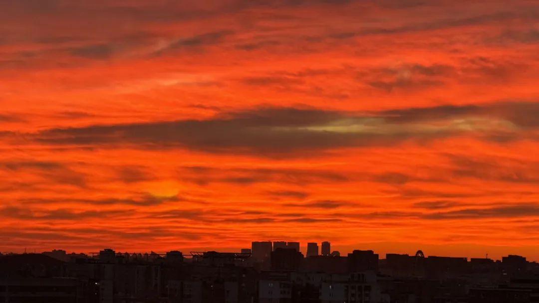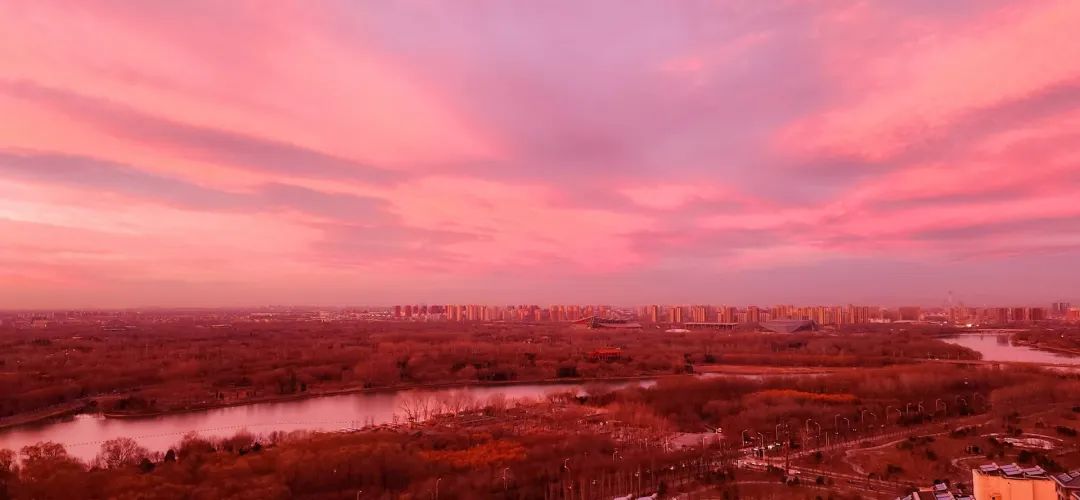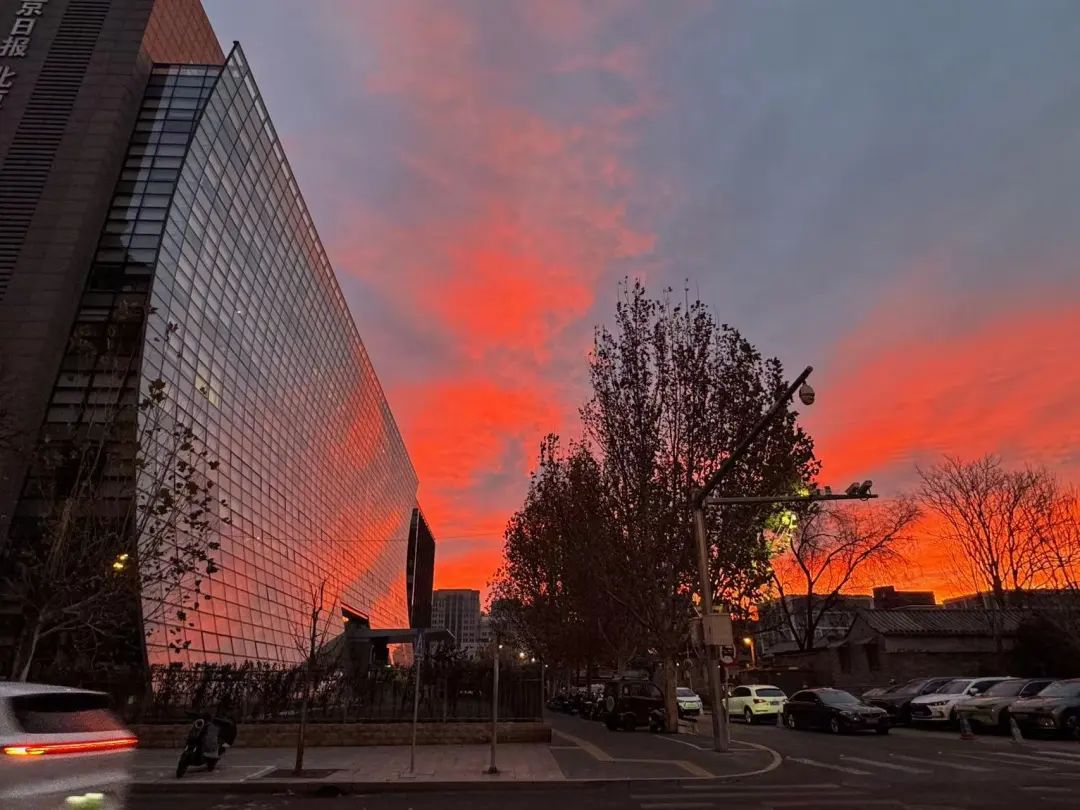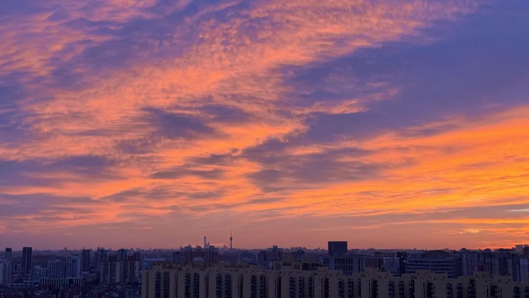 今晨,北京的冬日朝霞缓缓揭开夜幕的面纱,从温柔的粉紫色渐变到炽热的火红色,将天际渲染得色彩交织、美若油画。