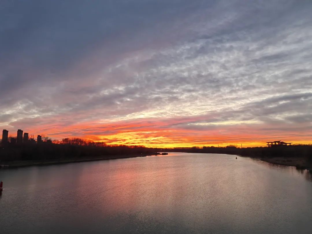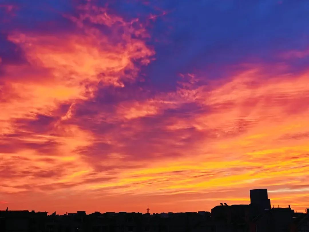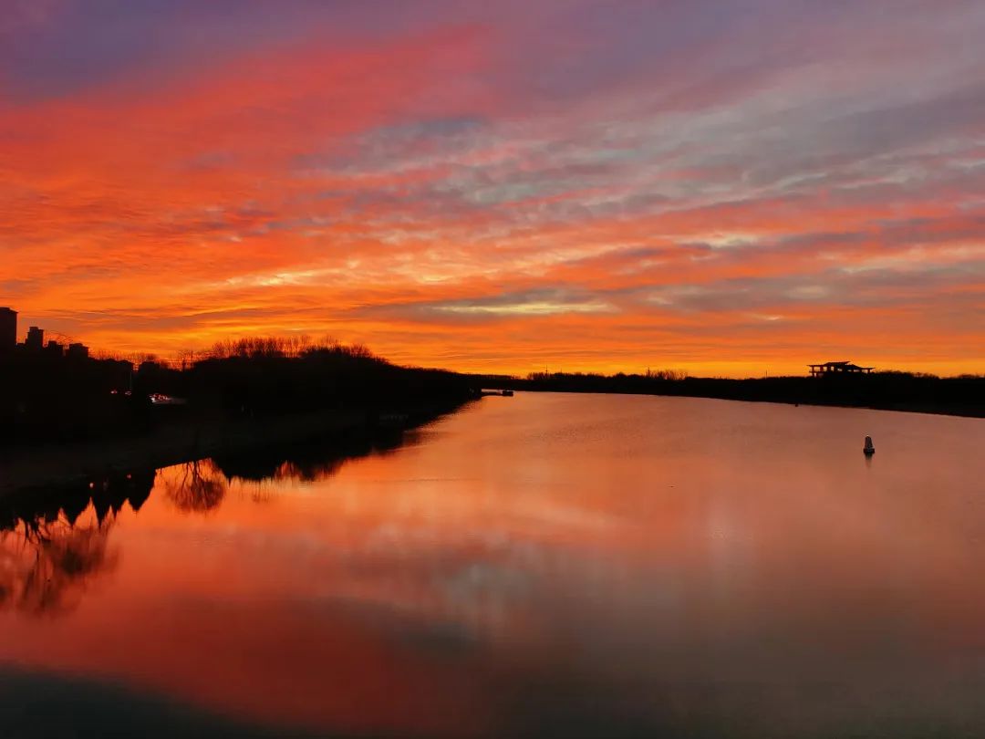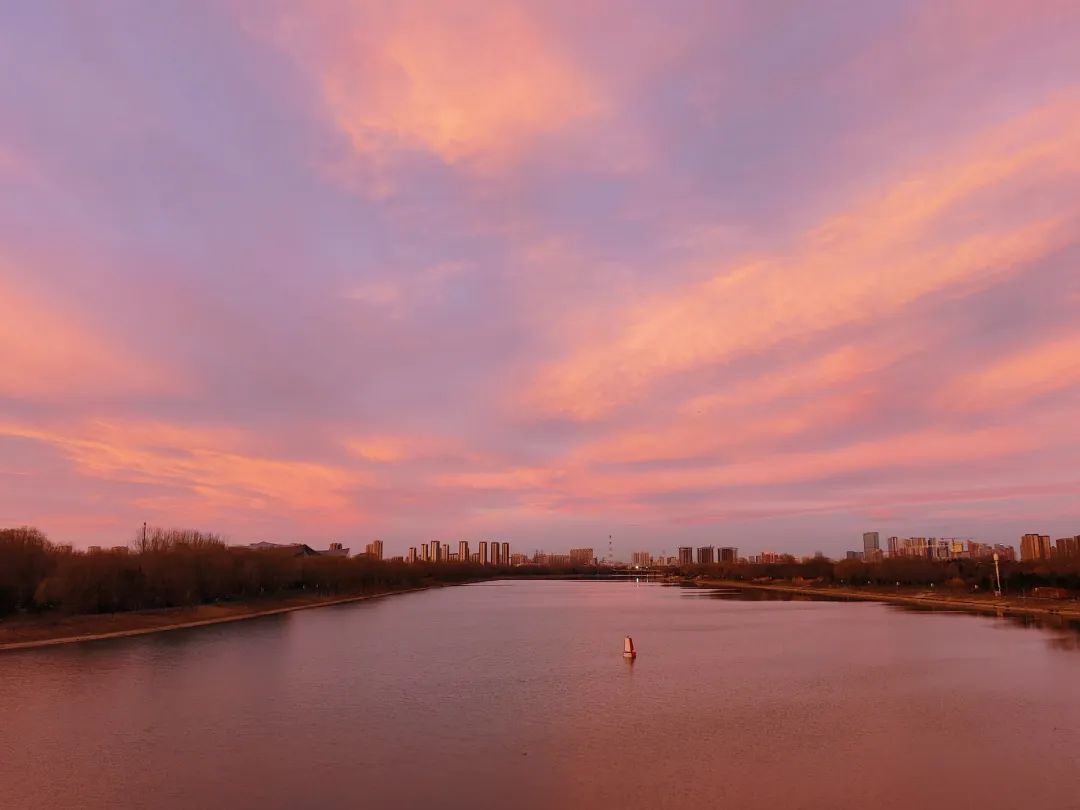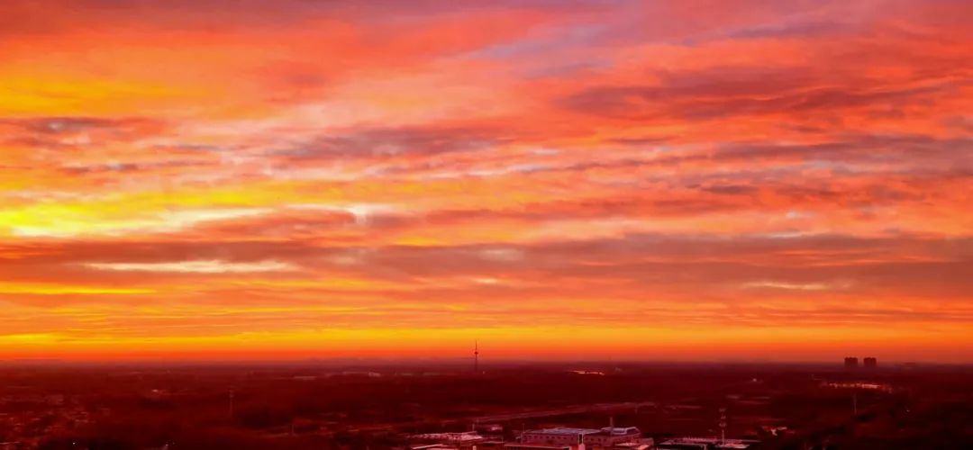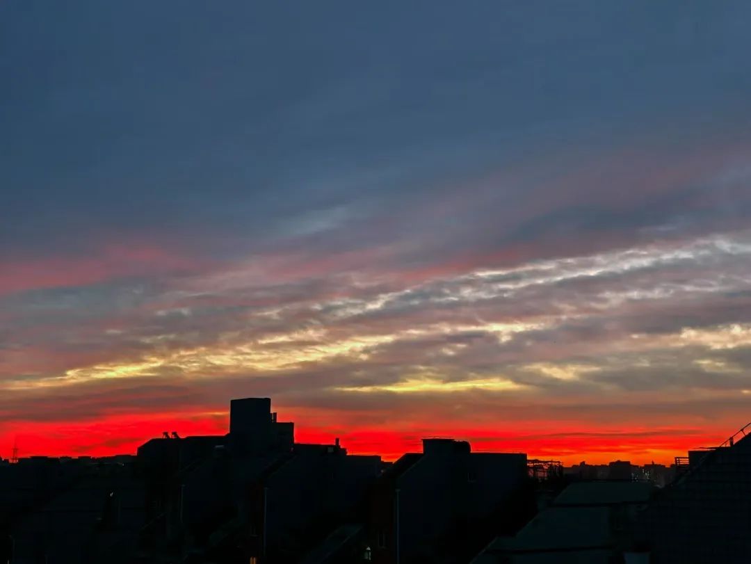今晨,北京的冬日朝霞缓缓揭开夜幕的面纱,从温柔的粉紫色渐变到炽热的火红色,将天际渲染得色彩交织、美若油画。