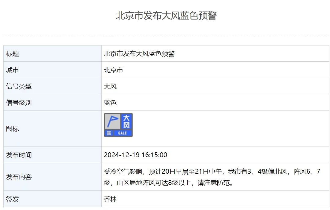 北京市发布大风蓝色预警:受冷空气影响,预计20日早晨至21日中午,我市有3、4级偏北风,阵风6、7级,山区局地阵风可达8级以上,请注意防范。