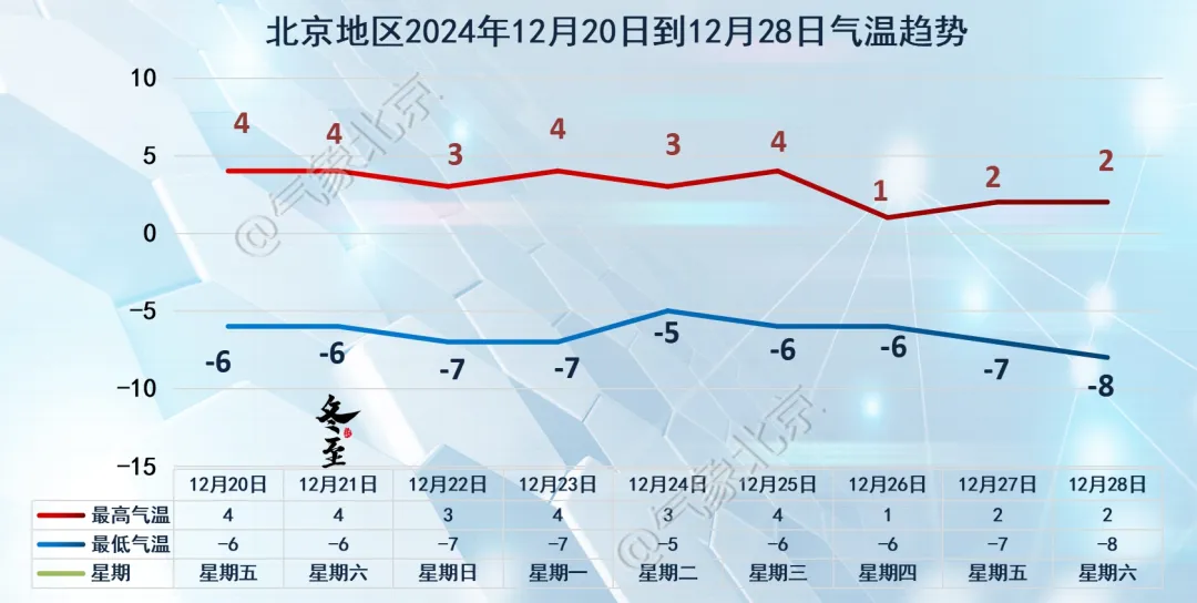 21 日(周六)白天:晴间多云;偏北风 3 级左右,阵风 6 级左右;平原地区最高气温 4℃,山区最高气温 0~4℃。
