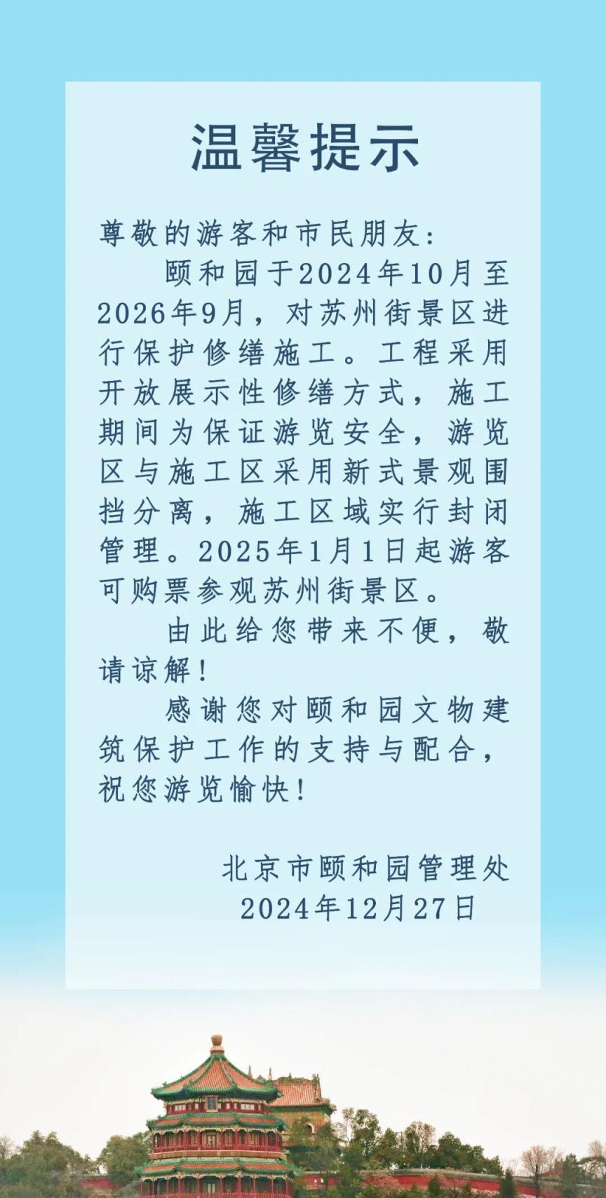 颐和园发布《温馨提示》:苏州街景区保护修缮工程采用开放展示性修缮方式。2025年1月1日起可购票参观。