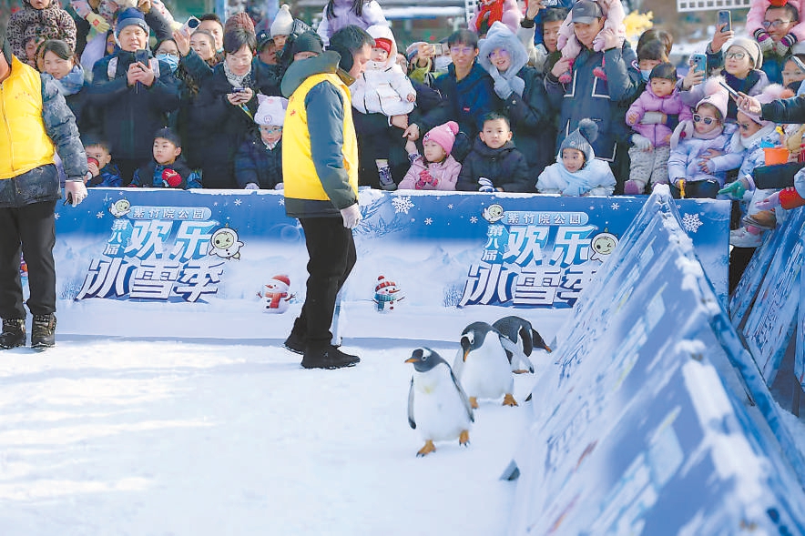 紫竹院公园欢乐冰雪季十分热闹。坐上6米高、70米长的网红冰滑梯,游客风驰而下,欢笑声不断。首次亮相的企鹅巡游萌趣十足,引得众多游客拍照留念。玩累了,活动区域周边的网红打卡地问月楼紫竹餐厅成为休憩之处,这里的西式简餐、咖啡、茶饮等美食热饮,让游客瞬间驱散寒意。