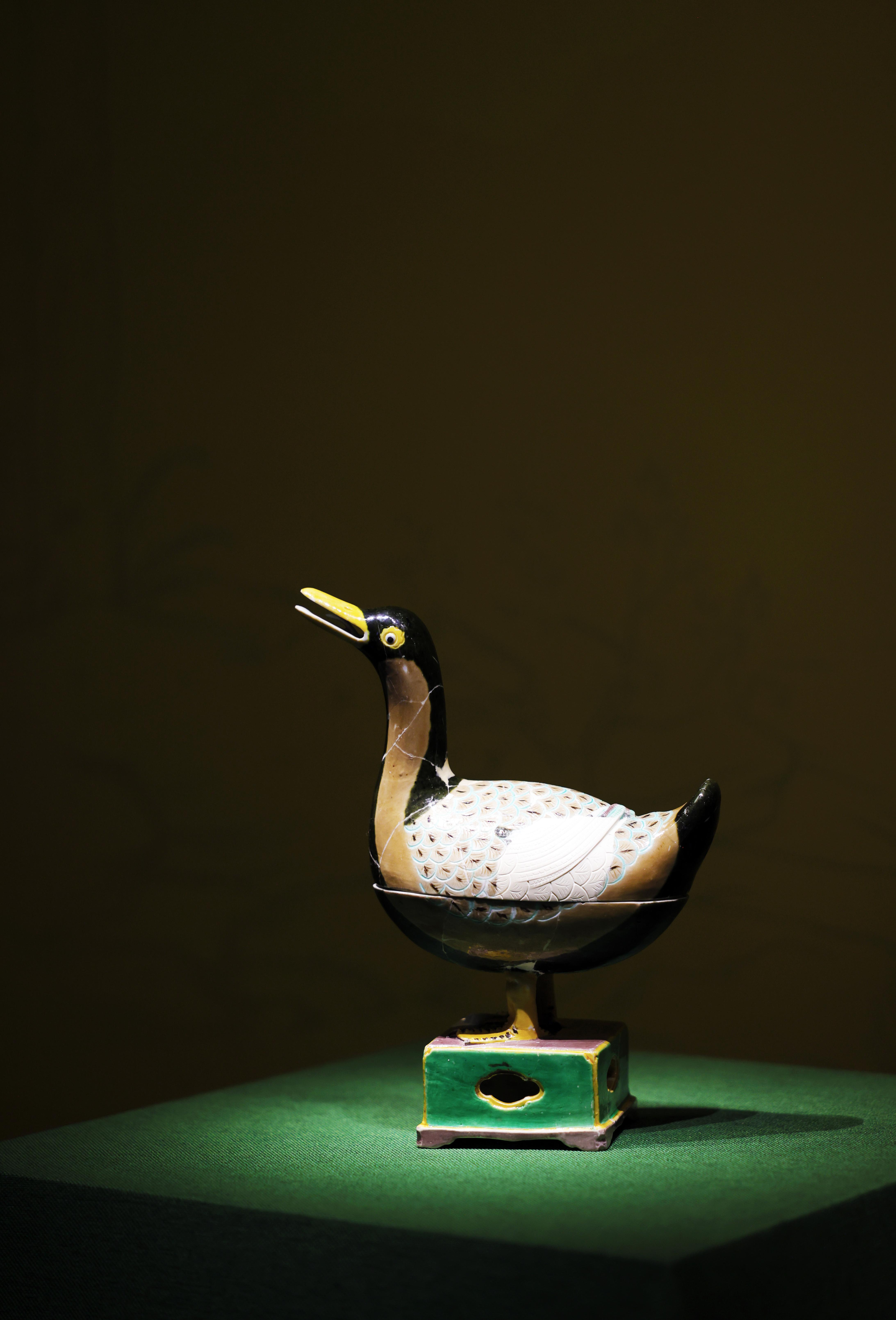 仙鹤、鹦鹉、龙、凤,还有麒麟等一众“瑞兽”最近齐聚恭王府博物馆乐道堂展厅,亮相“御瓷凝瑞——景德镇御窑遗址出土吉祥动物纹瓷特展”。造型奇特的成化青花凤穿花纹鹤颈瓶,目前发现的永乐朝御窑瓷器中器身最高的甜白釉盘口兽耳长颈瓶,以及景德镇御窑博物馆官方IP形象原型——成化素三彩鸭形香薰……120件景德镇御窑厂遗址出土的明代瓷器悉数到场,每一件都有吉祥动物纹为装饰。展品中还有多件是无传世品的修复件。