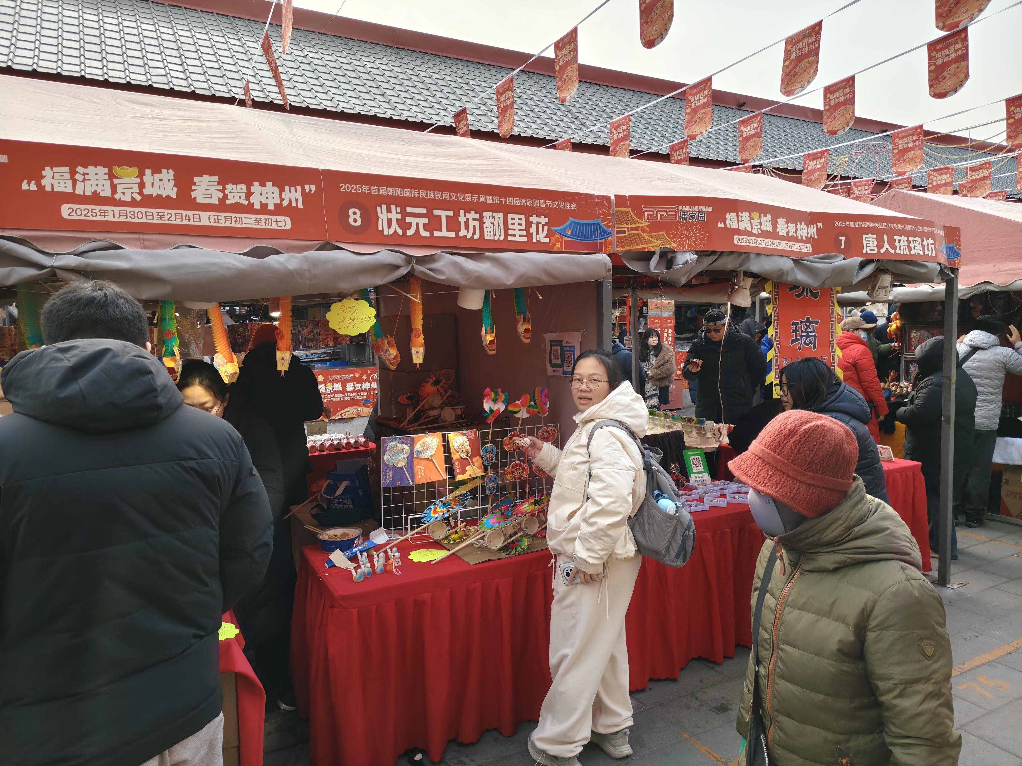 庙会门口,彩旗迎风飘扬,穿着盔甲造型的工作人员列阵两旁,游客纷纷打卡拍照,合影留念。进入旧货市场,向左望去,各地非遗代表性传承人早已准备就绪,状元工坊翻里花、唐人琉璃坊、漆八九大漆、钰珑非遗扎染等特色非遗产品让人目不暇接。信步游走,非物质文化遗产民俗文化街就在眼前。投身其中,马上就可以感受一场沉浸式的非遗文化体验。“这些小物件真精美,带孩子来看一看、玩一玩,也能让他感受传统文化的魅力。”游客朱女士笑着说。