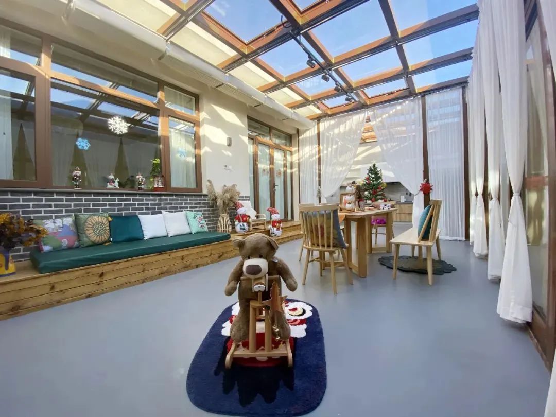 民宿室内有木马、玩偶、抱枕和专为小朋友准备的上下铺的亲子主题房,随处可见的摇椅、胡桃夹子玩偶深受小朋友喜爱,还有专属小宝宝的儿童娱乐区域,各类主题院落拓展了亲子休闲空间,非常适合亲子家庭居住。