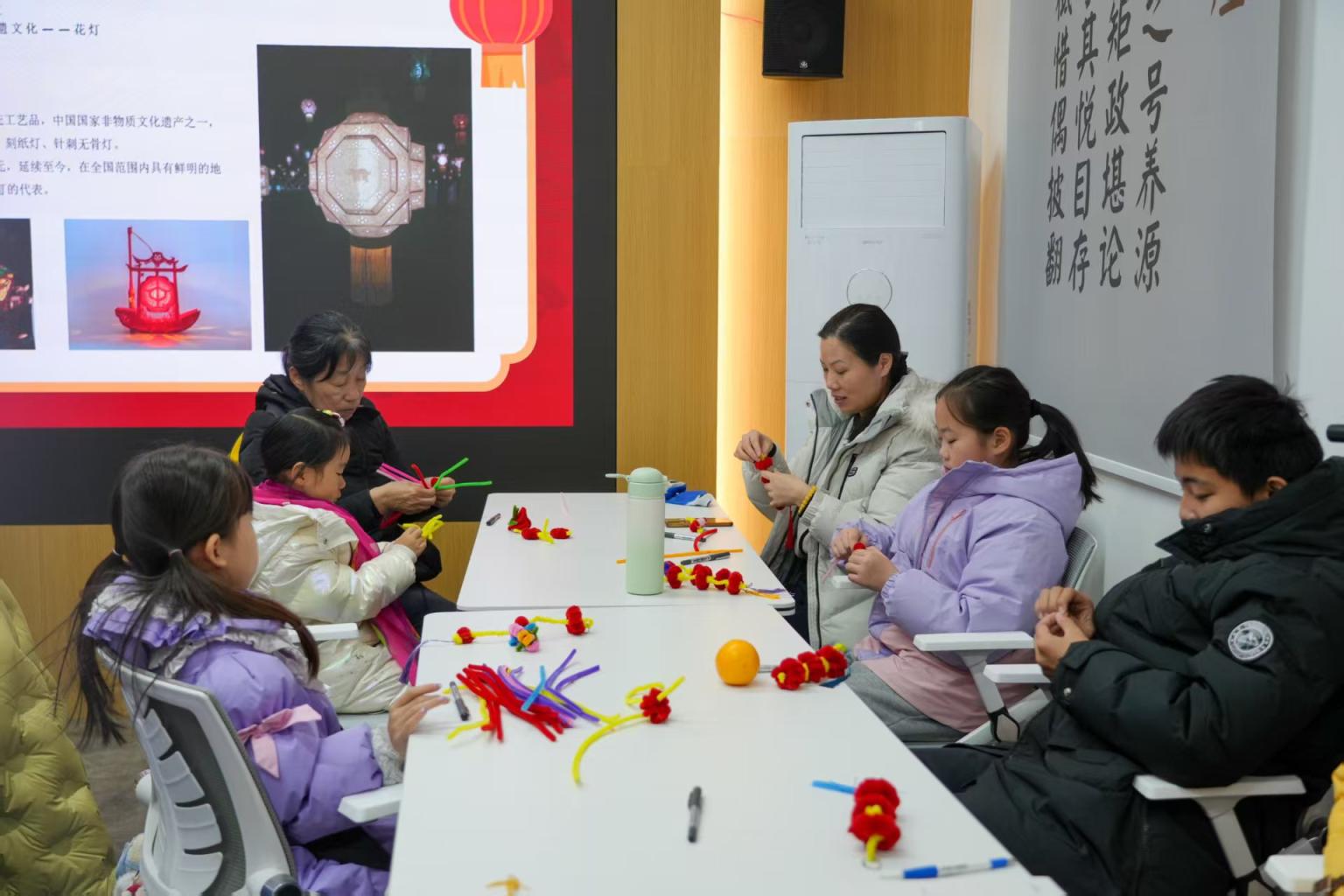 走进致远斋院内,近百盏红灯笼上悬挂着一则则灯谜,包含字谜、猜成语、猜地名、猜诗句等五花八门各种类别,喜庆的节日氛围吸引不少游客驻足参与。大家围在灯笼旁观看着灯谜,有的很快猜出,有的还在认真思考,也有的三五成群相互讨论着,一片欢声笑语。在活动现场,还设置元宵节“手作小灯笼”、拓印“福”字体验台,猜对灯谜的市民游客可以选择亲手制作一盏“蛇年卡通花灯”或拓印一份“福”字,把喜庆和福气带回家。