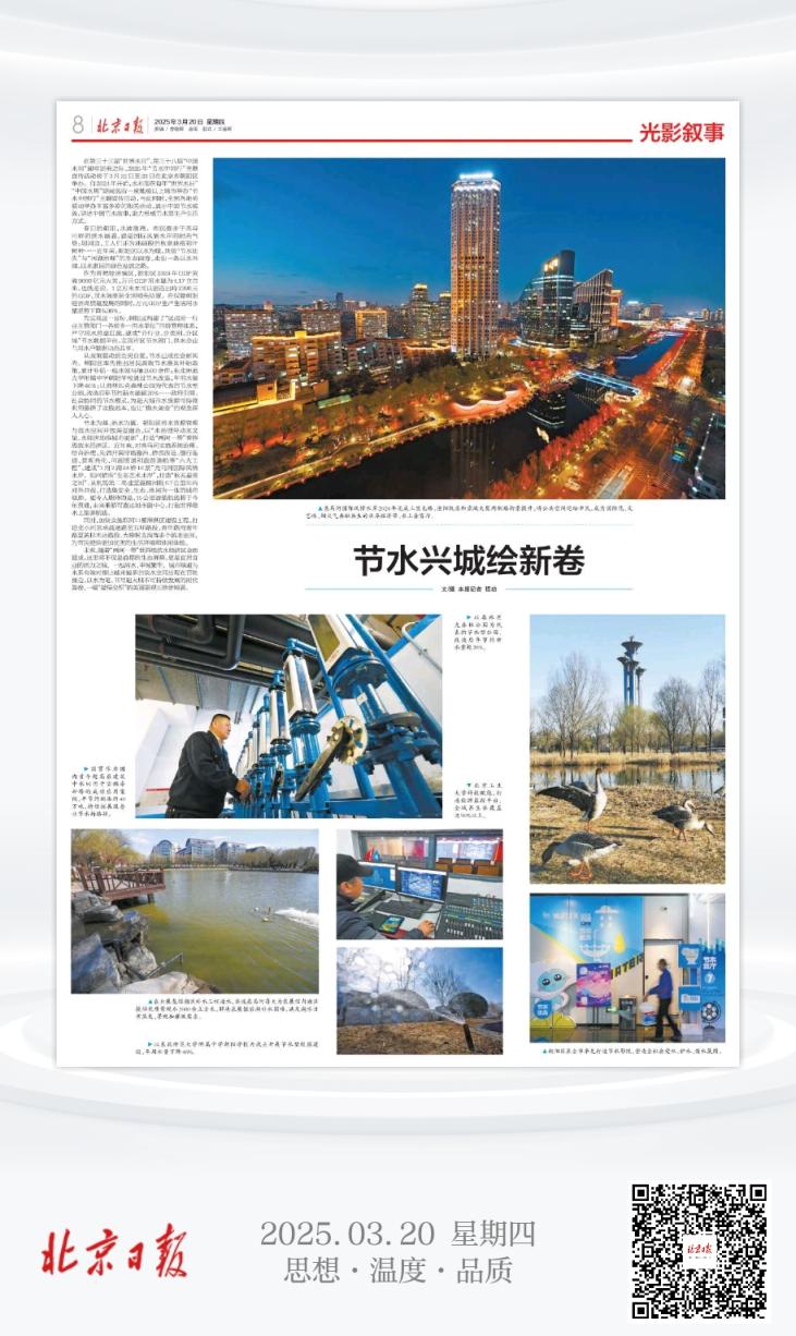 从政策驱动到全民自觉,节水已成社会新风尚。朝阳区率先推出居民高效节水器具补贴政策,累计补贴一级水效马桶2500余件;东北师范大学附属中学朝阳学校通过节水改造,年用水量下降46%;以奥林匹克森林公园为代表的节水型公园,改造后年节约新水量超20%……政府引领、社会协同的节水模式,为超大城市水资源可持续利用提供了实践范本,也让“惜水如金”的观念深入人心。
