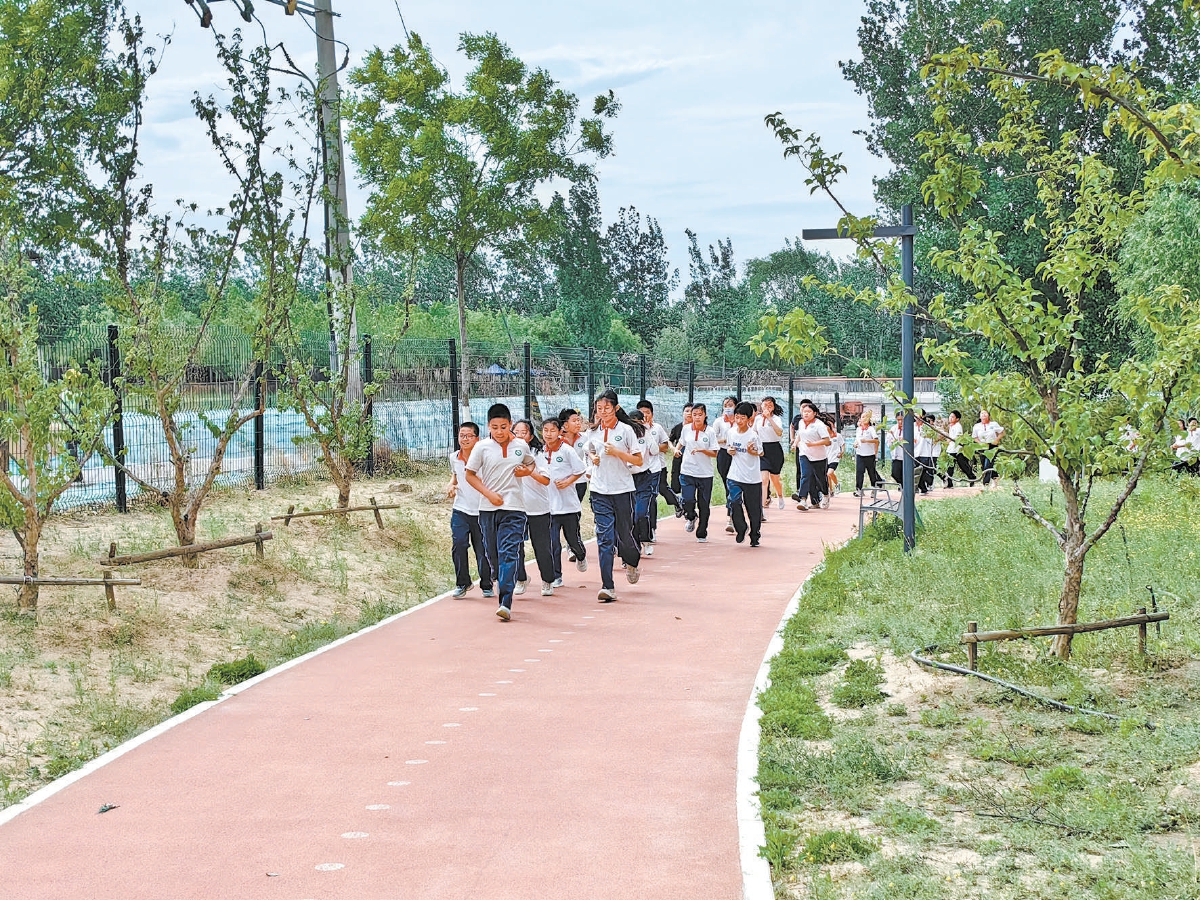 奥北森林公园里,绿意点点,一条流动的彩色校服队伍在树林间穿梭。“加油!两步一吸,两步一呼……”在体育老师的指导下,天通苑学校初中部的学生们开始了大课间长跑。他们迈着轻快的步伐,随节奏调整呼吸,肆意挥洒着汗水。“在公园里跑步比在操场上畅快多了!”学生刘雨禾说,“每天有机会到户外锻炼身体、放松一下,感觉心情更好了,自己更有活力了。”