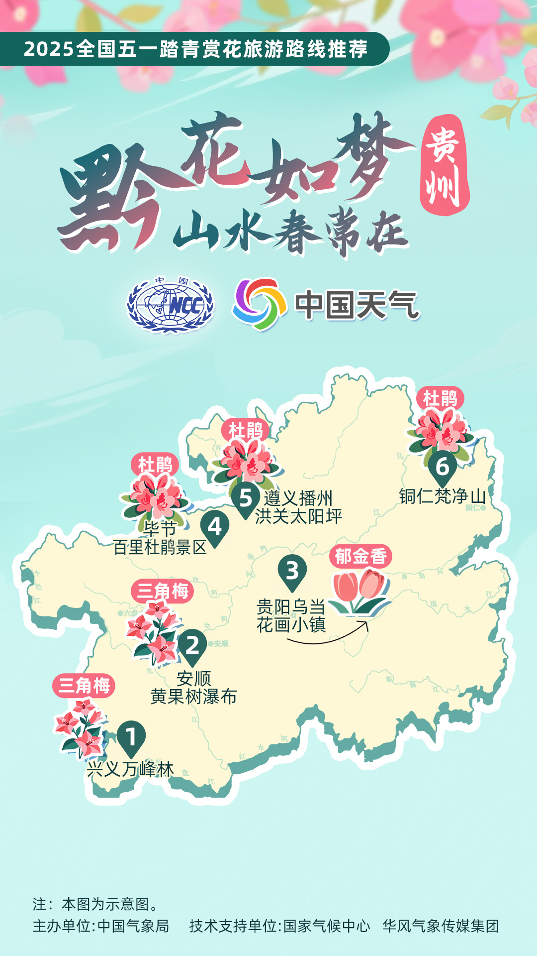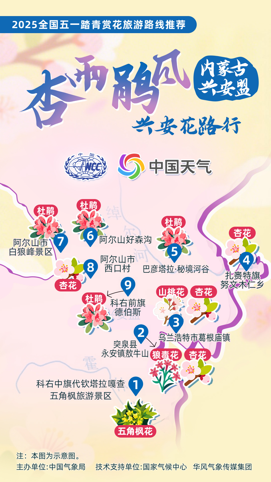 正值杏花、杜鹃花等春花盛放时节,中国气象局针对全国景点主要花品,对其生长积温和物候期进行关联性分析,建立多种花品的最佳观赏期预报模型,提供赏花预报服务。在此基础上,国家气候中心、华风气象传媒集团依据历史气候资料和今年气候预测,参考花期模型预报结果,结合区域地理分布、小气候特征和旅游景点等信息,推出4月下旬至5月上旬适宜踏青赏花的线路。
