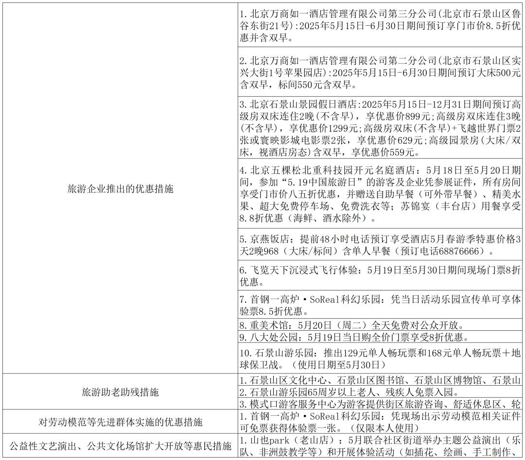 2025年“5·19中国旅游日”石景山区惠民措施汇总表