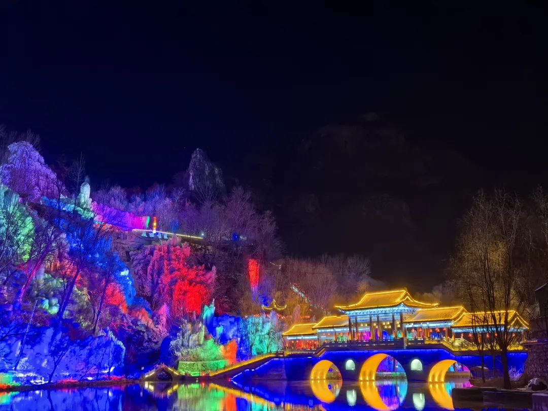 夜幕降临,所见之处的冰凌、冰柱,在彩灯照射下把这里变成了一个梦幻的七彩世界。