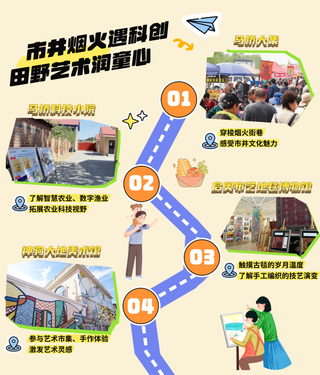 沿着“市井烟火遇科创,田野艺术润童心”研学路线,带您走进通州区马驹桥镇,从熙攘集市到科技农田,从经纬编织到艺术涂鸦,感受传统与创新的碰撞,让孩子的视野在体验中无限拓展。
