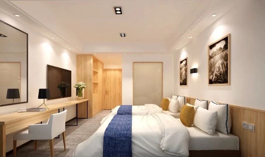 客房整体以白墙搭配原木色装潢