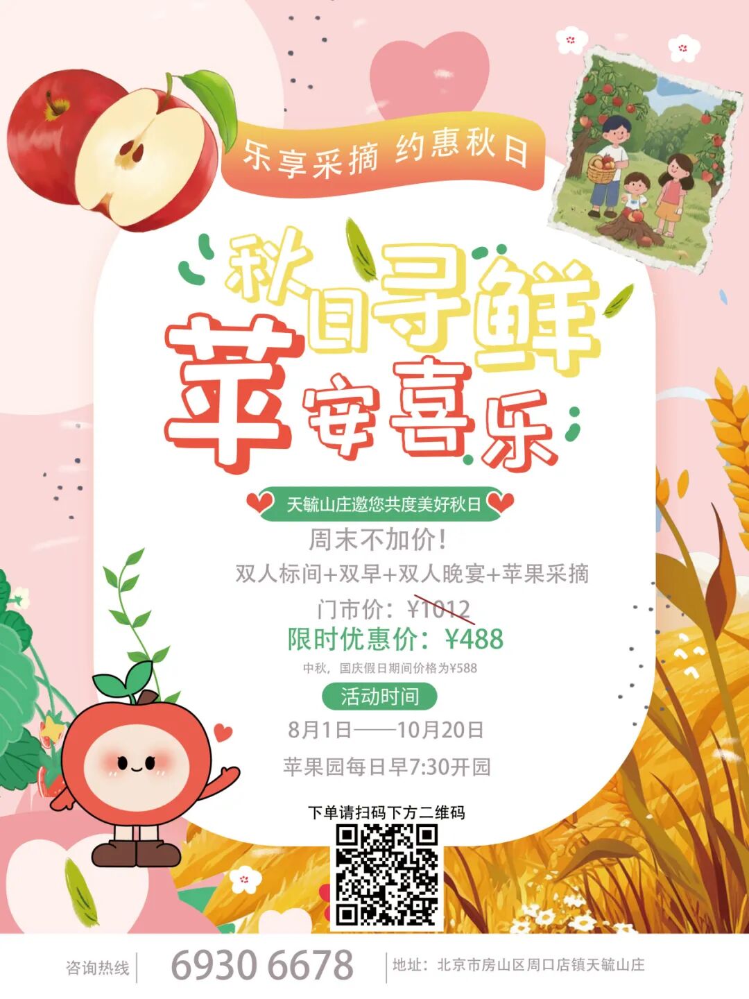 鲁丽苹果首摘季,天毓山庄专属套餐来啦!双人公寓标间,舒适入眠!双份早餐,开启元气一天!双份正餐,品味天毓私房美味!还有苹果采摘,新鲜直送舌尖!超值组合,就等你来!