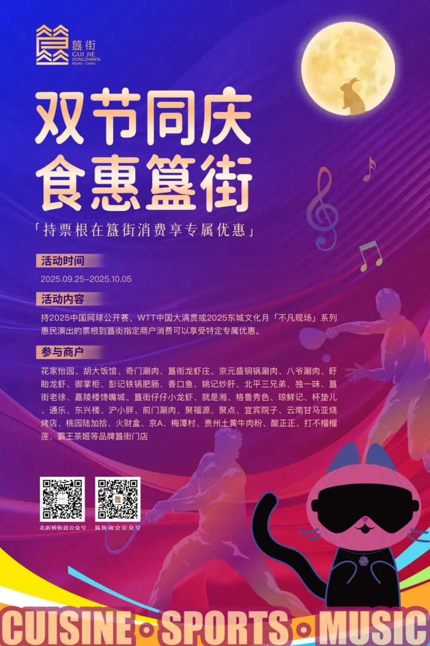 2025中国网球公开赛挥拍燃情、WTT中国大满贯对决引欢呼,东城文化月「不凡现场」亦启幕献艺……这个国庆中秋双节,北京文体热潮正盛,而簋街,要给这场盛宴叠加一道“美食buff”!
