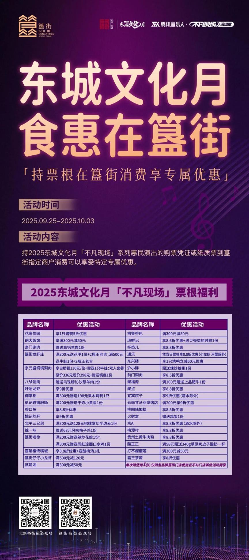 为了让市民、游客在赏赛事、品文化之余,更能尝遍京城烟火,北新桥街道、簋街管委会携手簋街商会,集结了花家怡园、胡大饭馆、奇门涮肉等近40家街区品牌商户,重磅推出“双节同庆•食惠簋街”主题活动。不用凑满减、不用抢券,一张票根就能解锁专属福利,让文体热情与美食满足“双向奔赴”!