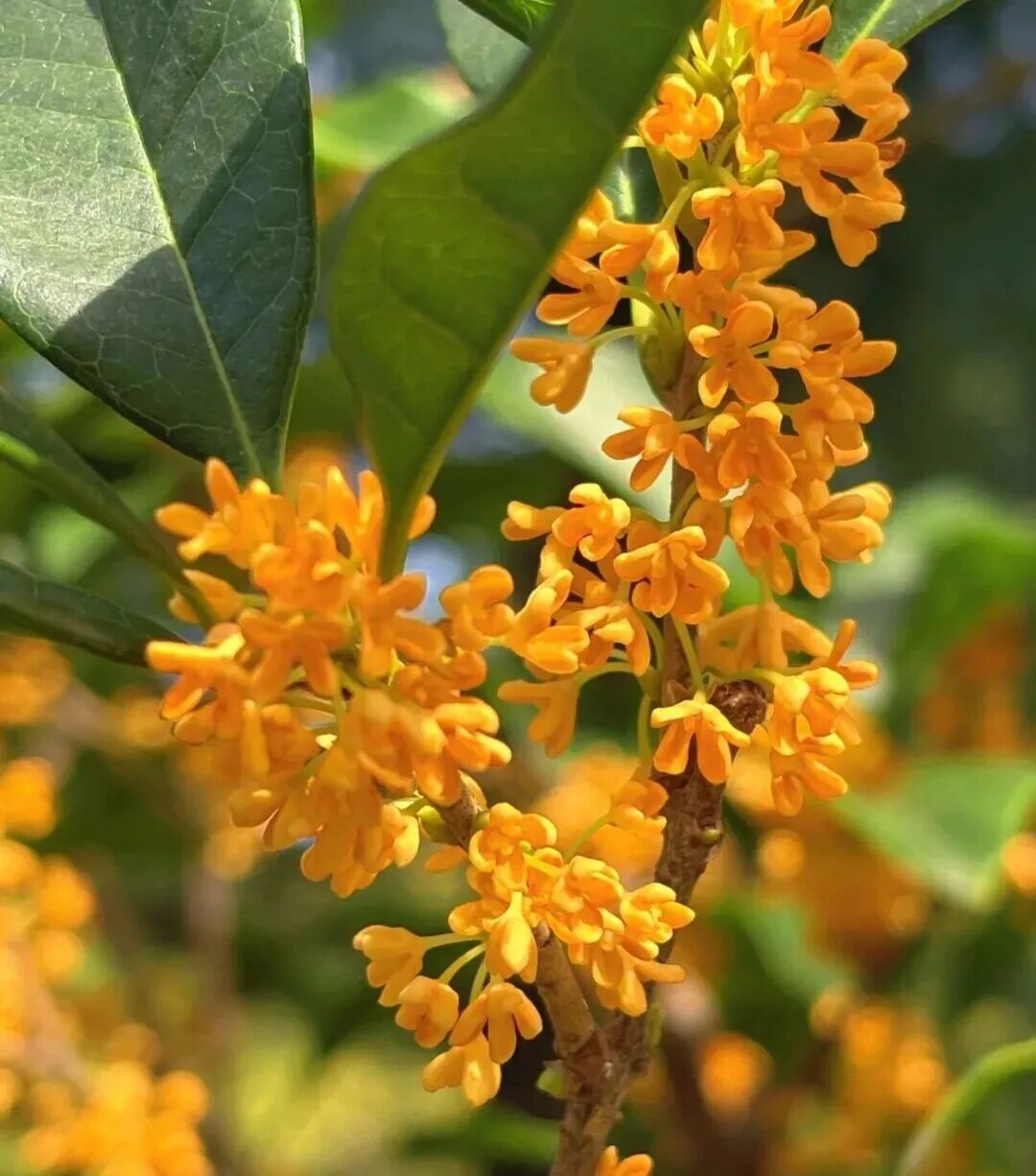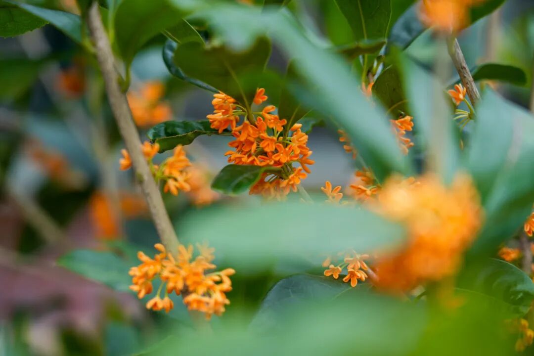 丹桂:花色橙红,艳丽夺目,在阳光下尤其璀璨,观赏性极强。其香气较金桂更为清雅,是拍照打卡的绝佳背景。