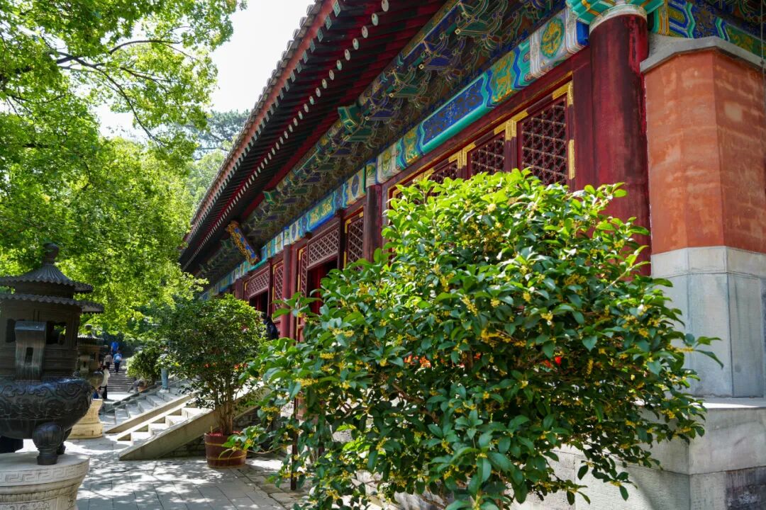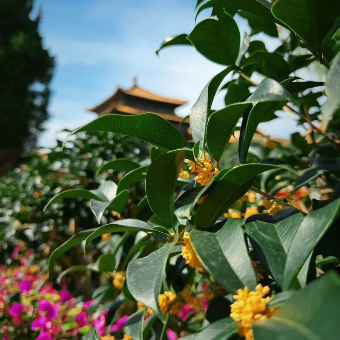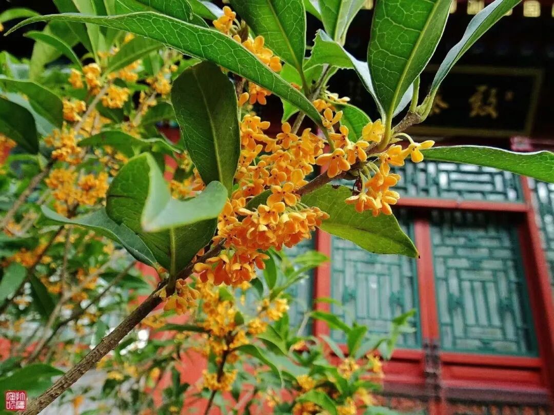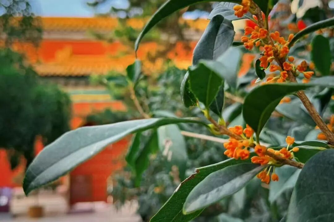 红墙黄瓦的古建背景下,朵朵桂花缀满枝头。淡雅芬芳中,让人不禁想起李清照笔下的“暗淡轻黄体性柔,情疏迹远只香留。何须浅碧轻红色,自是花中第一流。“