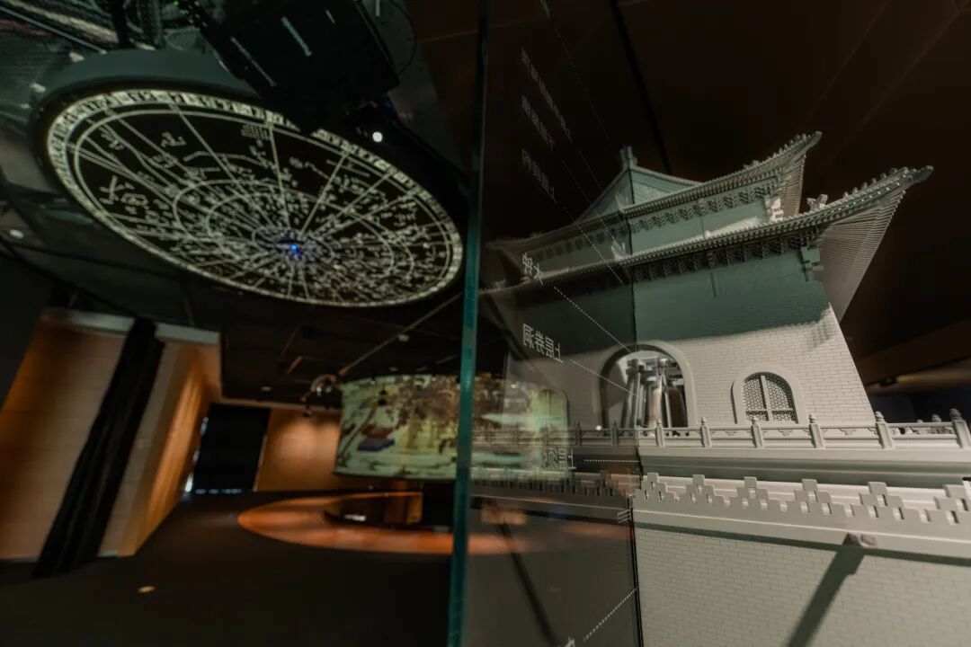 从“宅兹中国”蕴含的“天地之中”理念出发,展区以古人“仰观天文、俯察地理”的智慧为起点,用铜钟、天文图与钟鼓节律,还原“以钟定序、以历计时”的生活哲学。这里的钟声不仅是物理层面的声波,更承载着古人联结天地、调度城市晨昏的功能。敲击悬挂的铜钟,沉厚的回响里仿佛能听见千年前北京的晨钟暮鼓,配合天花灯箱流转的南宋石刻天文图与中轴线动画,时光的流转变得可听可感。