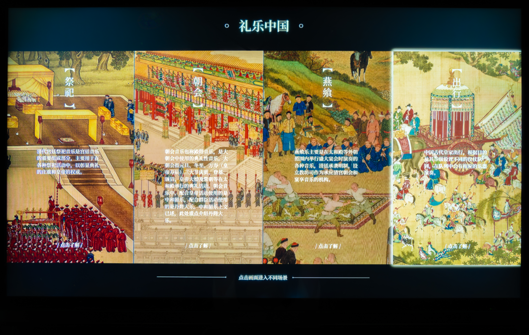 展区深挖“秩序的声音”,通过宫廷礼乐与文人雅乐,诠释中轴线上“礼为天地之序、乐为天地之和”的文明内核。特别设置“聚音罩”:读者步入罩下,便能听到以祭祀、朝会、宴飨、出行为核心的四大场景专属礼乐,在沉浸式聆听中感知明清宫廷音乐的庄重与雅致,感知礼乐如何塑造古代社会的秩序与和谐。