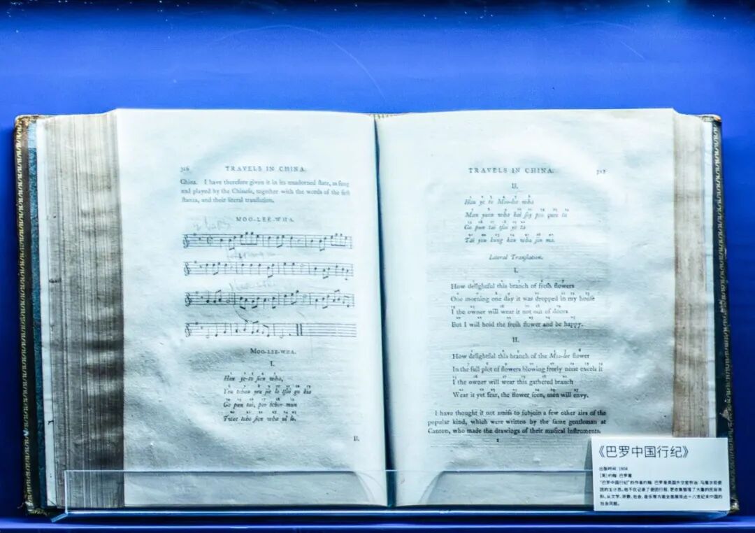 由英国人约翰・巴罗(John Barrow)于1804年初次出版的《巴罗中国行纪》(Travels in China),基于其作为马戛尔尼使团成员的访华经历,描述了清代政治制度、商贸体系、手工产业及宗教文化习俗。书中特别附上《茉莉花》的乐谱、拼音唱词及英文翻译,将中国民间旋律带向西方,成为中西文化交流的重要见证。